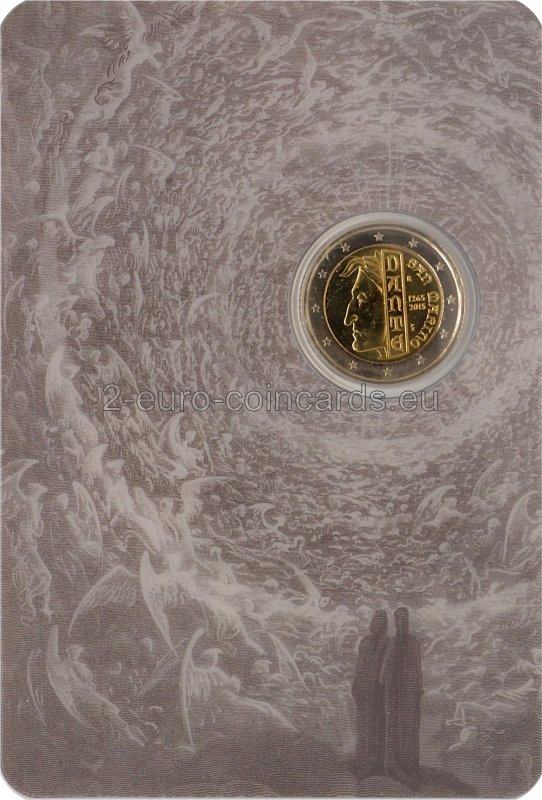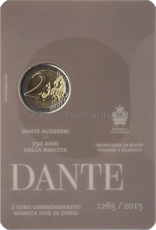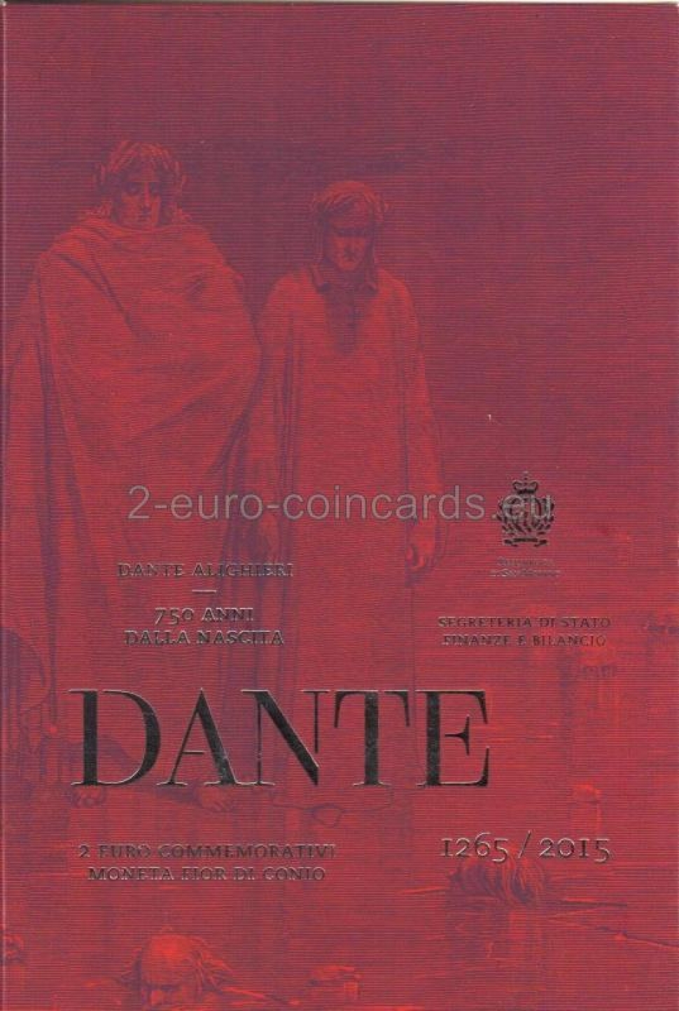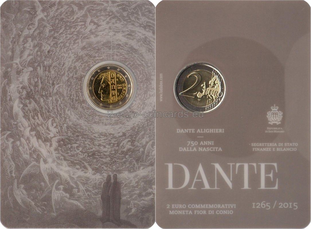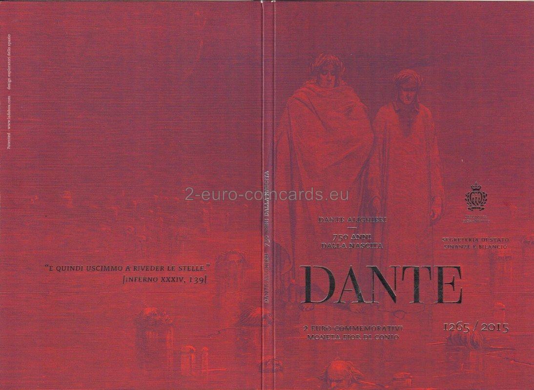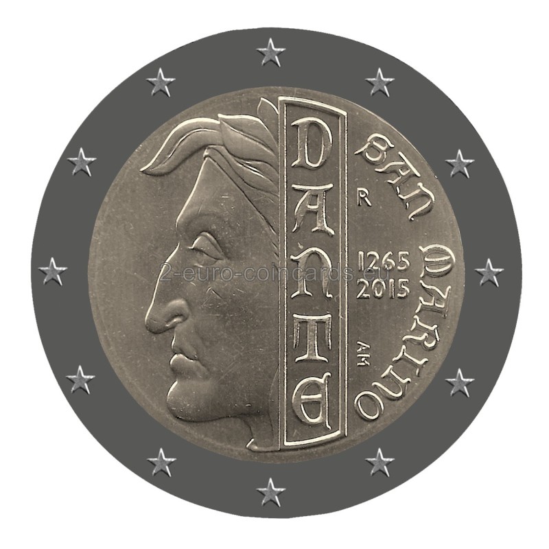 Vzor, ktorý vytvorila Annalisa Masiniová zobrazuje portrét Danteho prevzatý z fresky od Botticelliho. Vpravo od portrétu sa na zvislej osi nachádza nápis „DANTE“. Vpravo od vnútorného stredu je názov vydávajúceho štátu „SAN MARINO“ v polkruhu. Medzi týmito dvomi nápismi je značka mincovne „R“, roky „1265“ a „2015“ a iniciály umelkyne „AM“. Štýl písma použitý na označenie štátu a motívu mince bol inšpirovaný tvarom písma v prvých vydaniach diela Divina Commedia (Danteho Božskej komédie).