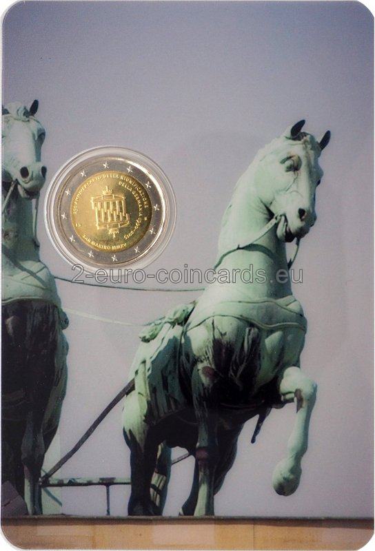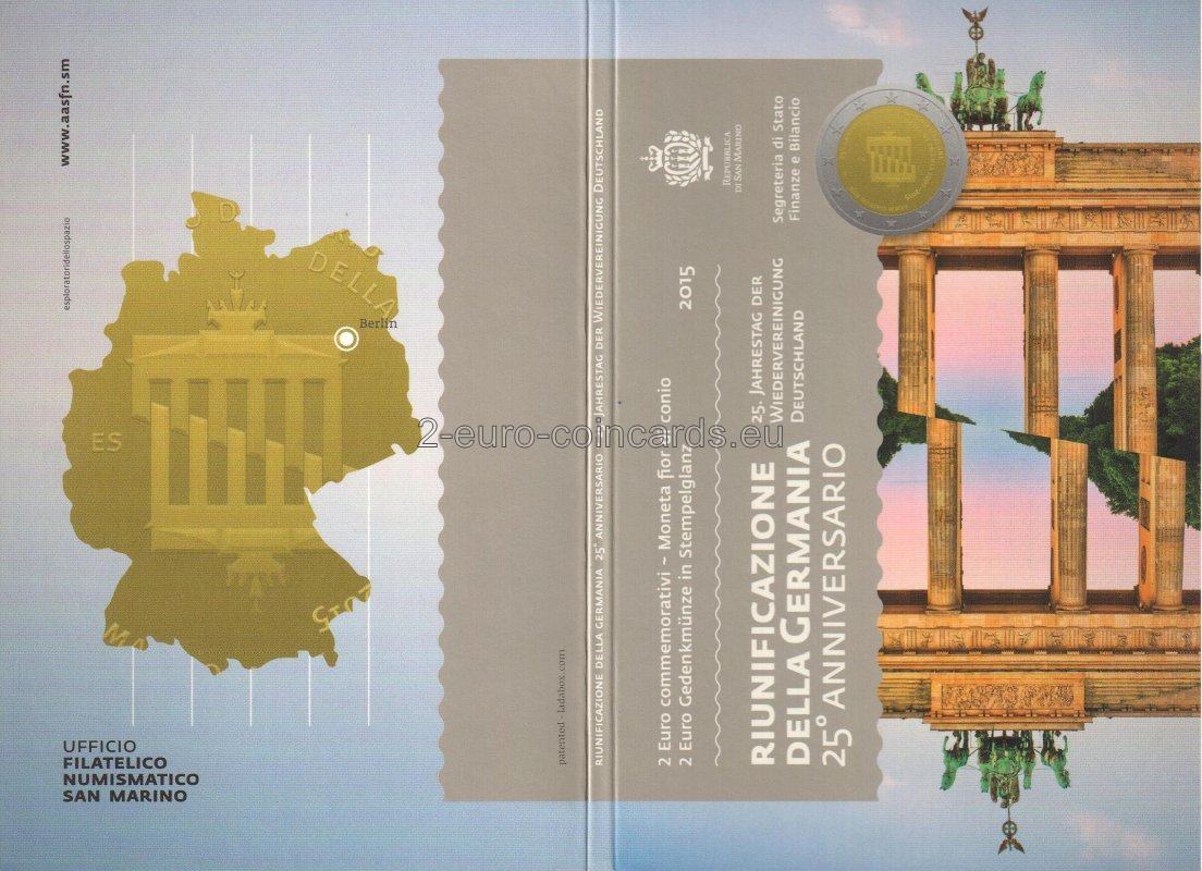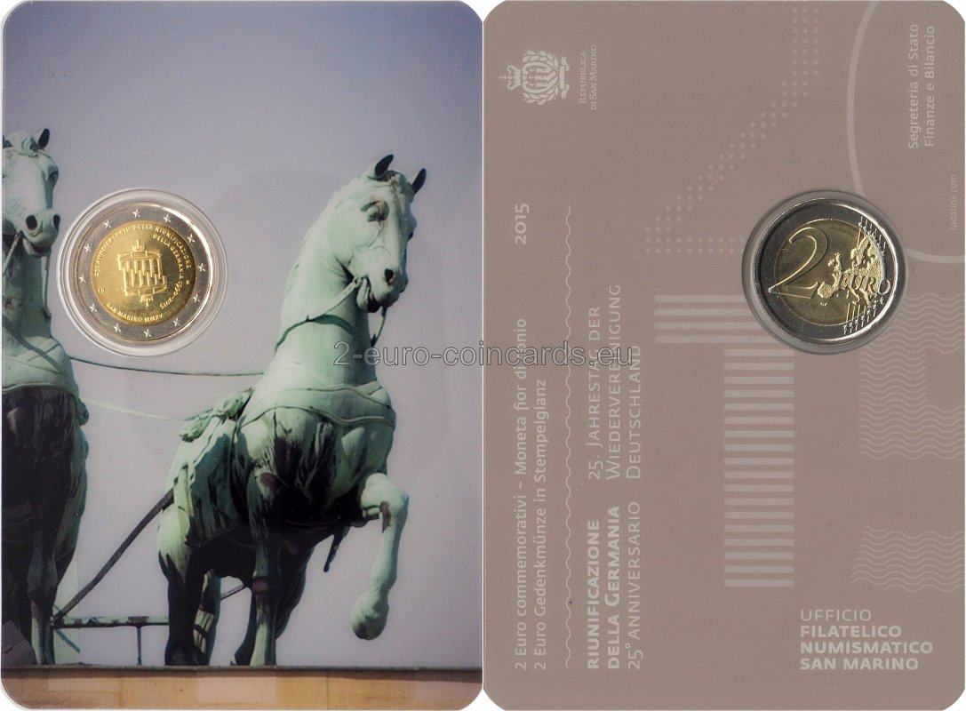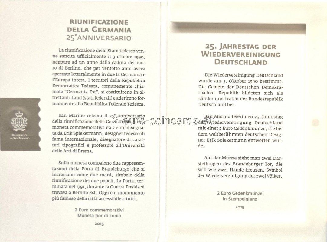 Návrh zobrazuje Brandenburskú bránu, ktorá sa počas studenej vojny nachádzala vo východnom Berlíne, v dvoch vyobrazeniach, ktoré sú navzájom prepletené ako dve spojené ruky, čo symbolizuje znovuzjednotenie oboch častí Berlína. Naľavo sa nachádza značka mincovne „R“ a iniciály umelca „ES“ (Erik Spiekermann). V kruhu okolo motívu je vyrazený nápis „25o ANNIVERSARIO DELLA RIUNIFICAZIONE DELLA GERMANIA 1990-2015“ (25. výročie znovuzjednotenia Nemecka) a krajina a rok vydania „San Marino MMXV“.