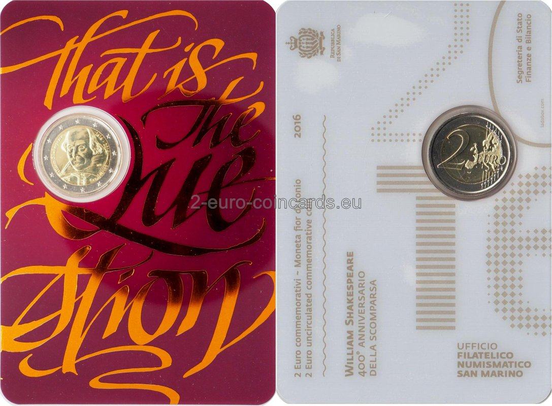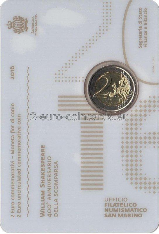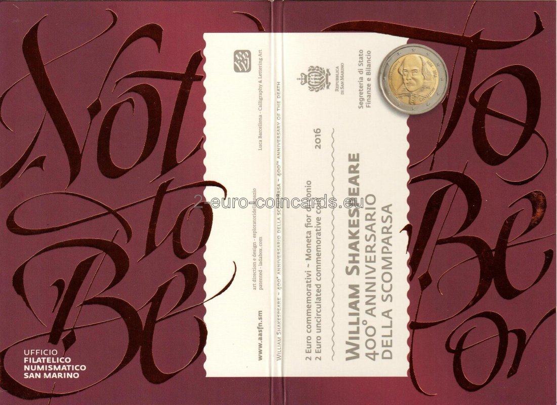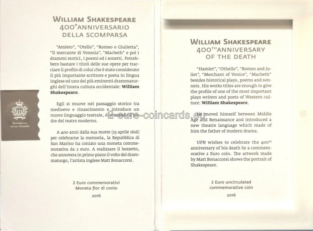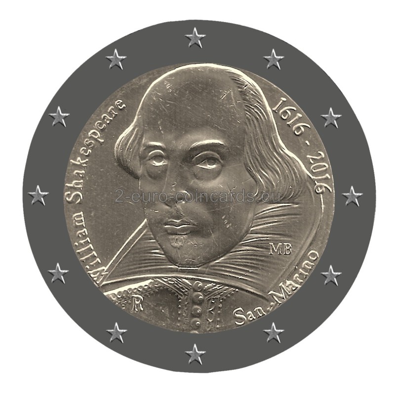 Vzor znázorňuje portrét básnika. Na pravej strane sú v polkruhu uvedené dátumy „1616 – 2016“ a názov vydávajúcej krajiny „San Maríno“; vpravo dolu sa nachádzajú iniciály umelca „MB“. Vľavo je v polkruhu uvedený nápis „William Shakespeare“; vľavo dolu je umiestnená značka mincovne „R“.