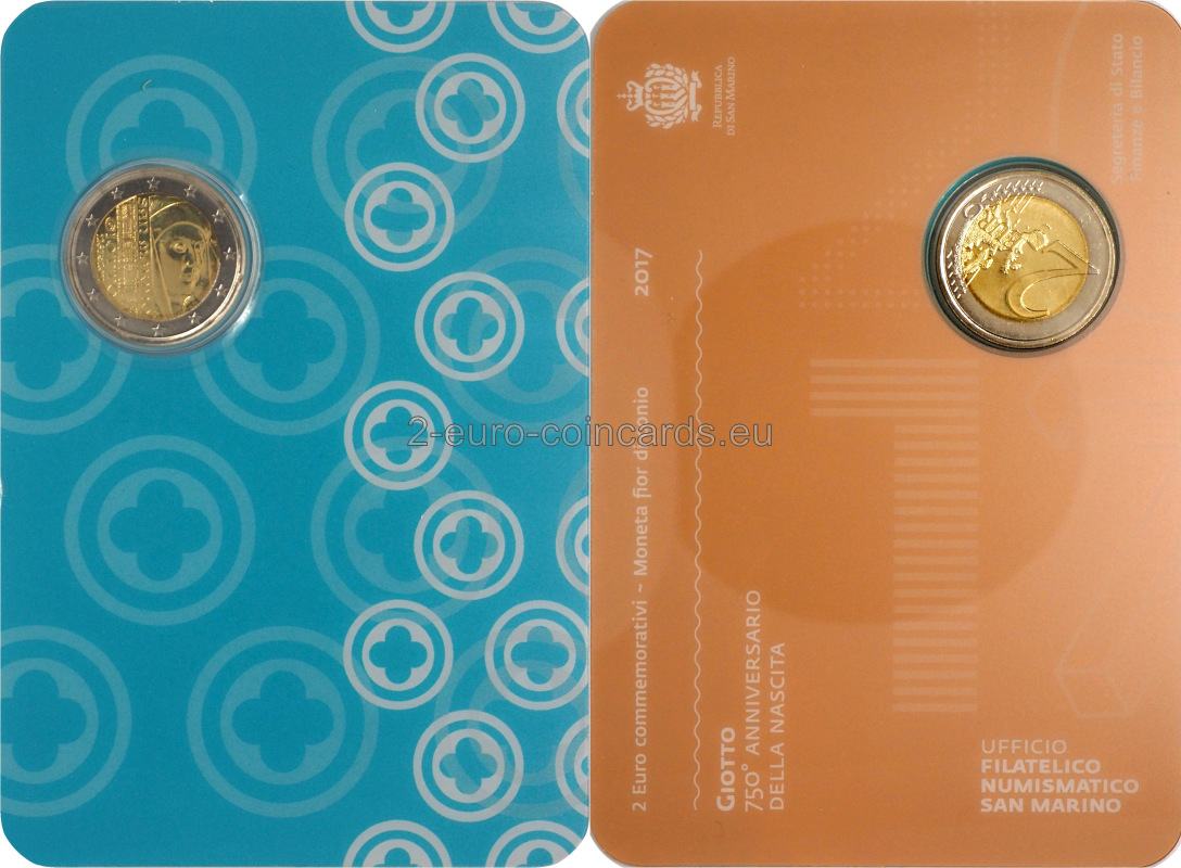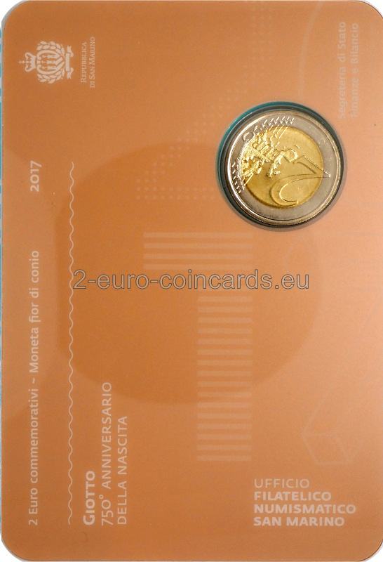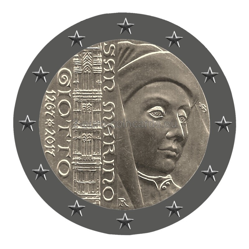 Na ľavej strane mince sa nachádza detail veže s hodinami z jedného z Giottovych architektonických diel, dómu Santa Maria del Fiore vo Florencii, a vertikálne umiestnené slová SAN MARINO, GIOTTO a roky 1267-2017. Na pravej strane je detail portrétu Giotta a iniciály autora mince Luciany de Simoni (LDS). V dolnej časti je písmeno "R", značka mincovne v Ríme.
