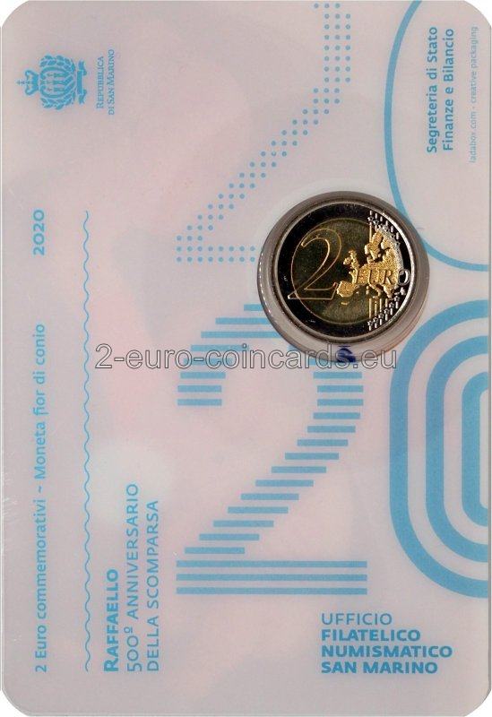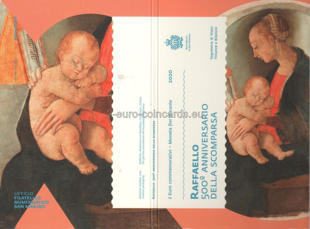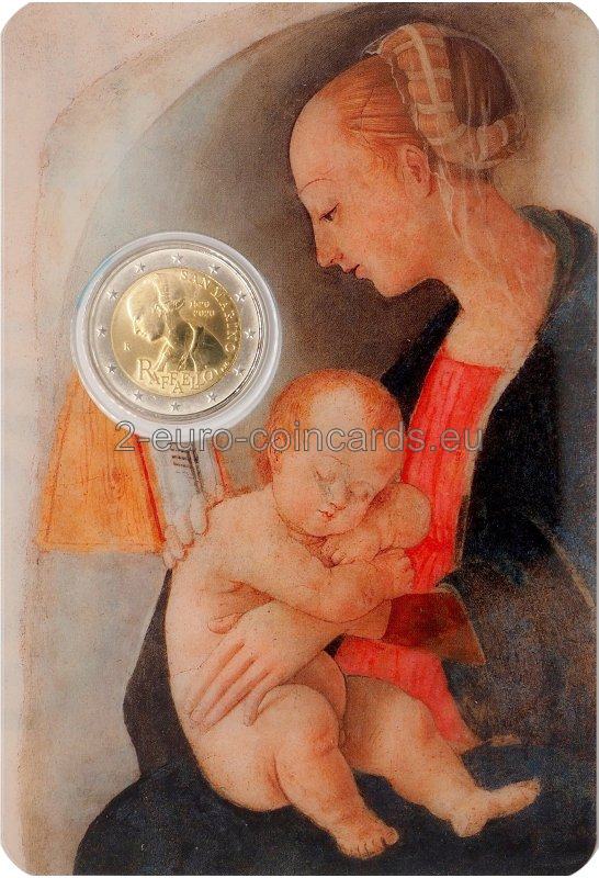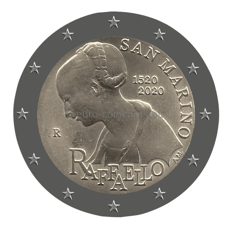Na vzore je vyobrazený profil Panny Márie, detail fresky „Madonna di Casa Santi“. V pravej hornej časti mince sa nachádza názov vydávajúcej krajiny „SAN MARINO“ a roky „1520“ a „2020“. V dolnej časti mince je nápis „RAFFAELLO“, vpravo od neho iniciály autorky Annalisy Masiniovej „A.M.“ a vľavo písmeno „R“, značka rímskej mincovne.