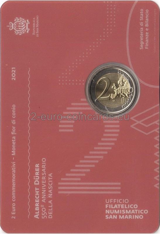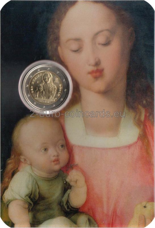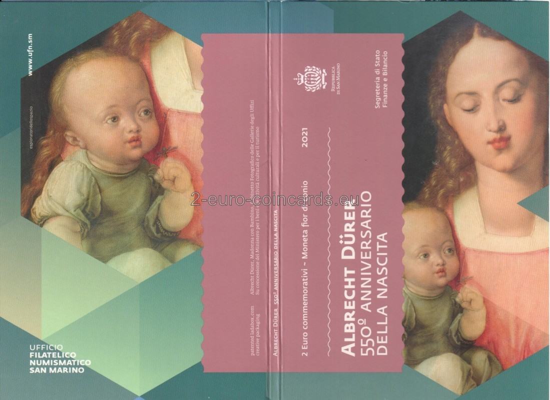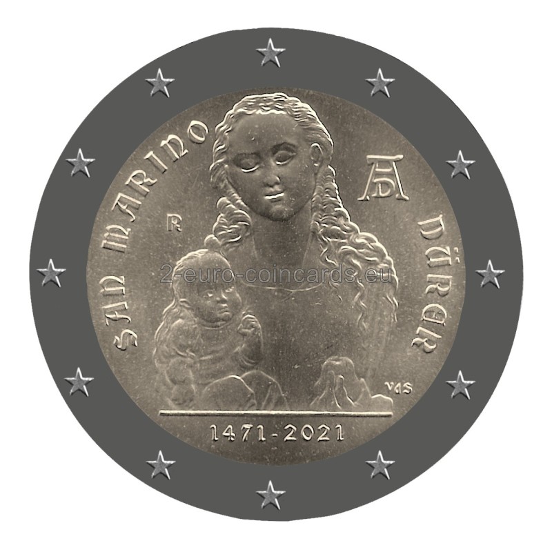 Na vzore je vyobrazená Panna Mária s Ježiškom, časť obrazu Albrechta Dürera Madona s dieťaťom, ktorý sa nachádza v galérii Uffizi vo Florencii. Vľavo je nápis „SAN MARINO“ a znak mincovne „R“. Vpravo hore sa nachádza monogram Albrechta Dürera „AD“ a na pravej strane nápis „DÜRER“. V dolnej časti mince sú iniciály autora vzoru Valeria De Seta „VdS“ a roky „1471 – 2021“.