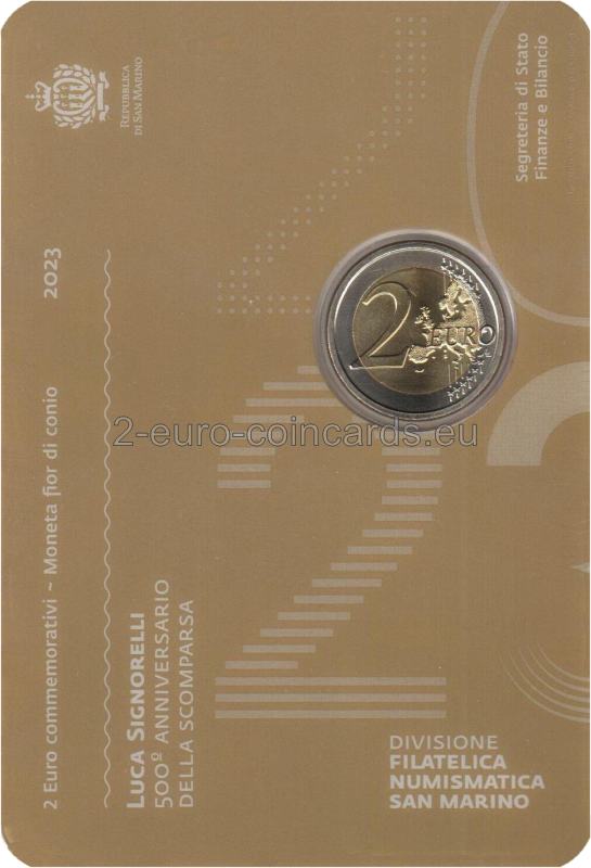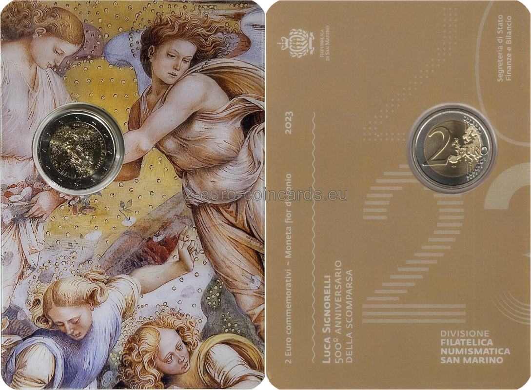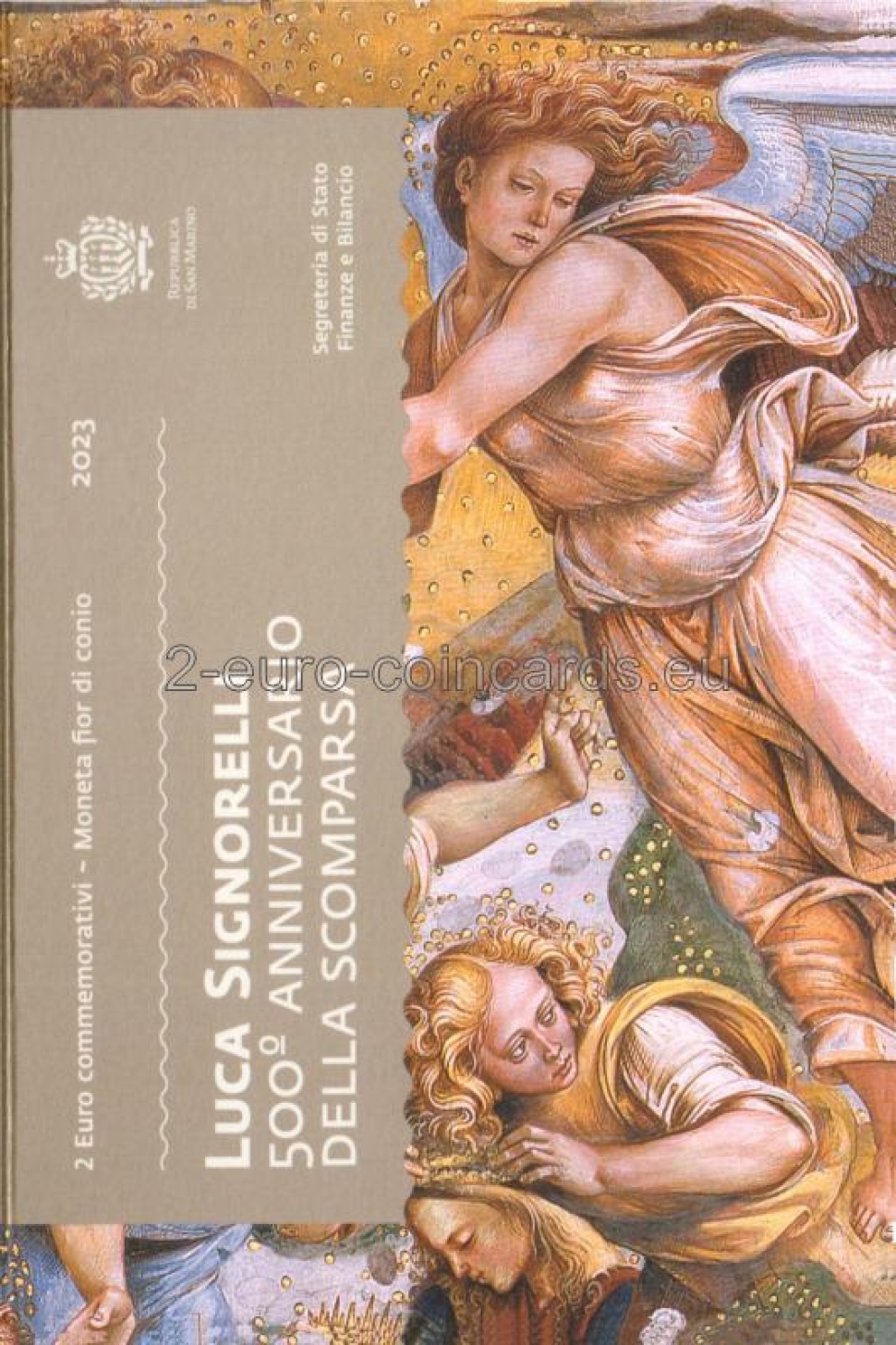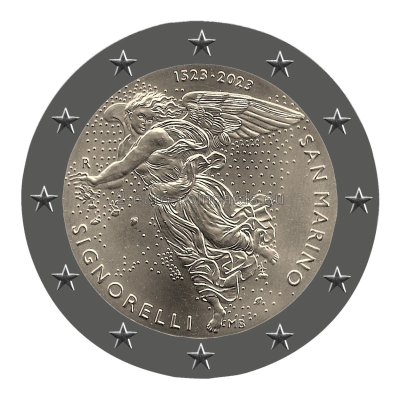 V strede mince je vyobrazený anjel, detail z obrazu „Il Paradiso“, ktorý namaľoval Luca Signorelli, zachovaného v kaplnke San Brizio v katedrále v Orviete. Na ľavej strane sa nachádza písmeno „R“ označujúce rímsku mincovňu. Vľavo dole je do polkruhu uvedené slovo „SIGNORELLI“. Na pravej strane sa nachádza názov vydávajúcej krajiny „SAN MARINO“ a hore sú uvedené roky „1523 2023“. V spodnej časti mince v strede sa nachádzajú iniciály autorky Marty Bonifaciovej „MB“.