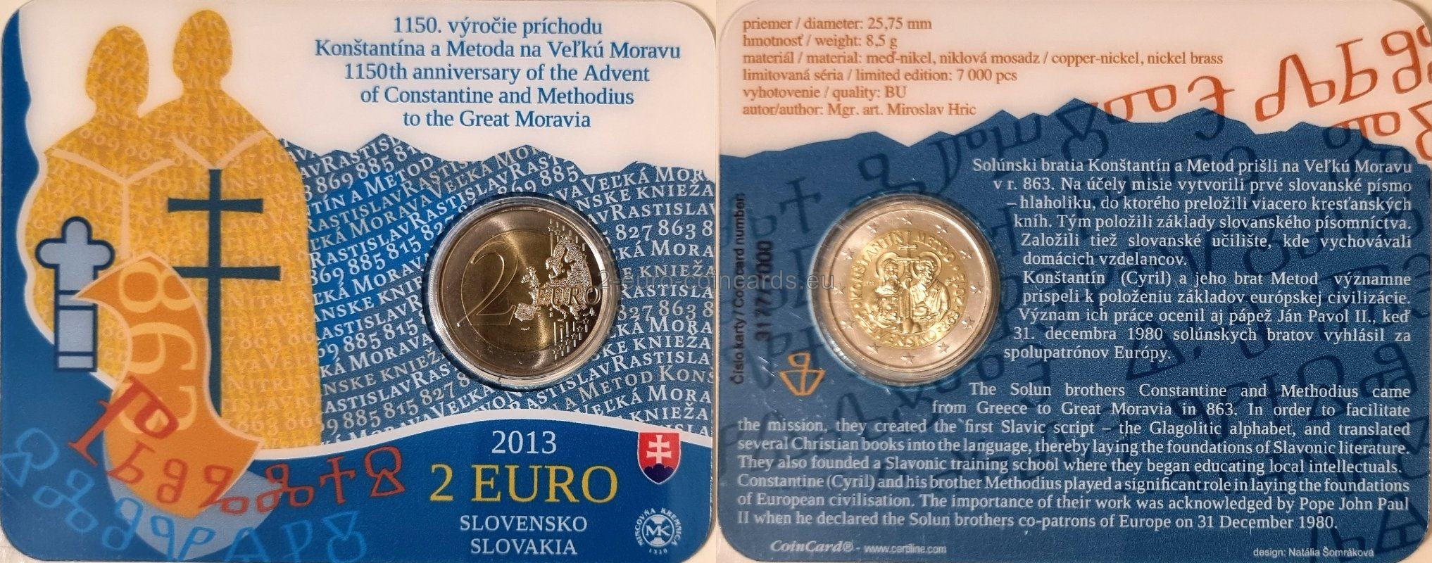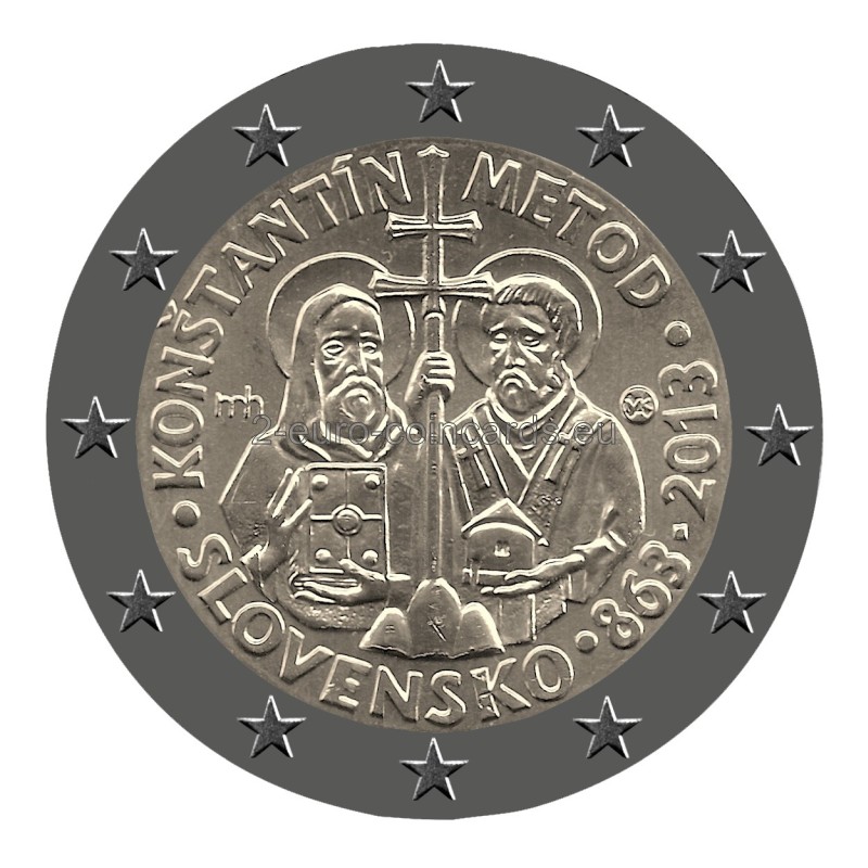Do tradičnej súťaže o návrh mince sa prihlásilo 22 prác od 13 autorov. Z nich osobitná komisia Národnej banky Slovenska vybrala v júni 2012 najlepší návrh. Počas konzultačného konania však Európska komisia pôvodný návrh mince zamietla. Národná banka Slovenska musela z mince odstrániť náboženské symboly - svätožiare a kríže na páliu Metoda. Toto rozhodnutie Európskej komisie vyvolalo na Slovensku pobúrenie. Miestni katolícki biskupi uviedli, že vyjadruje neúctu ku kresťanským tradíciám v Európe. Po rokovaniach v decembri 2012 medzi slovenským ministrom financií Petrom Kažimírom a ministrami financií ostatných krajín eurozóny Rada Európskej únie pôvodný návrh mince predsa len schválila.