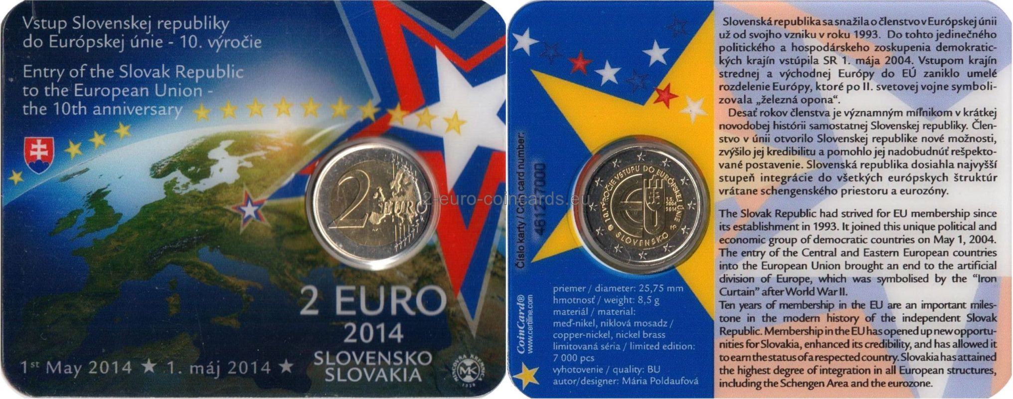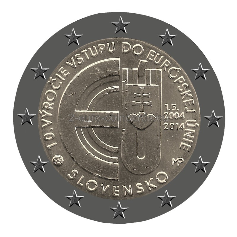 V strede národnej strany mince sú štylizované písmená „EÚ“ ako skratka výrazu Európska únia so štátnym znakom Slovenskej republiky, ktorý je začlenený do popredia. Na pravej strane vnútornej časti mince je v dvoch riadkoch vyobrazený dátum pristúpenia Slovenskej republiky k Európskej únii „1.5.2004“ a bezprostredne pod ním rok „2014“. Na dolnom okraji vnútornej časti mince sa nachádza vpísaný názov vydávajúcej krajiny „SLOVENSKO“, pričom na hornom okraji sú v polkruhu uvedené slová „10. VÝROČIE VSTUPU DO EURÓPSKEJ ÚNIE“. Vľavo dole je značka mincovne Kremnica (pozostávajúca z písmen „MK“ medzi dvoma razidlami) a vpravo dole sa nachádzajú štylizované písmená „MP“, ktoré sú iniciálkami autorky motívu Márie Poldaufovej.