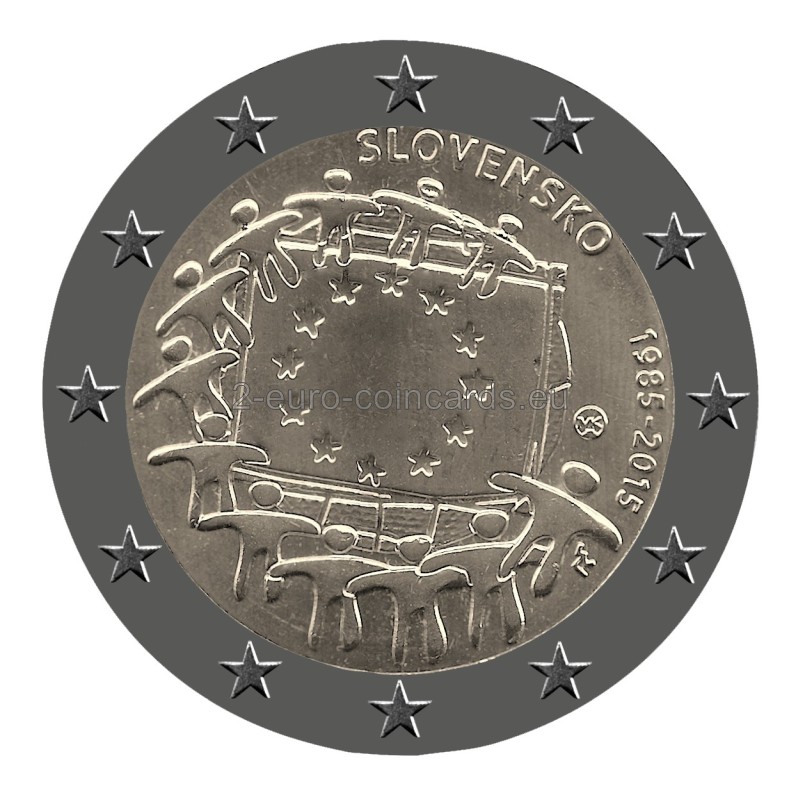 Vzor zobrazuje vlajku EÚ ako symbol, ktorý spája ľudí a kultúry s rovnakými víziami a ideálmi lepšej spoločnej budúcnosti. Dvanásť hviezd, ktoré sa menia na ľudské postavy, predstavuje zrodenie novej Európy. Vpravo hore je v polkruhu uvedený názov vydávajúcej krajiny „SLOVENSKO“ a roky „1985 – 2015“. Vpravo dolu sa nachádzajú iniciály umelca Georgiosa Stamatopoulosa.