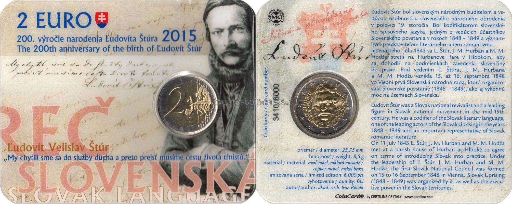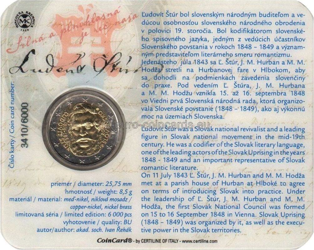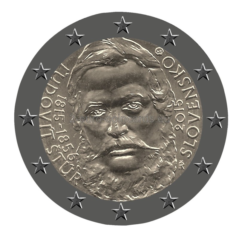 Minca znázorňuje portrét Ľudovíta Štúra. Vpravo od portrétu rovnobežne s hranou vnútornej strany mince je vyrazený rok vydania „2015“ a vpravo od neho pozdĺž hrany názov vydávajúcej krajiny „SLOVENSKO“. Naľavo od portrétu rovnobežne s vnútornou hranou mince sú vyrazené dátumy Štúrovho narodenia a úmrtia „1815–1856“ a ešte viac vľavo pozdĺž hrany meno „ĽUDOVÍT ŠTÚR“. V pravej hornej časti motívu je značka Mincovne Kremnica pozostávajúca z iniciál „MK“ umiestnených medzi dvoma razidlami. V pravej dolnej časti sú štylizované písmená „IŘ“, čo sú iniciály autora návrhu Ivana Řeháka.