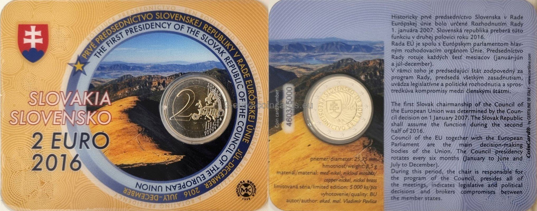 Dominantou vzoru je štátny znak Slovenskej republiky v strede na pozadí dynamických zbiehajúcich sa čiar predstavujúcich postavenie a význam Slovenskej republiky počas jej predsedníctva v Rade Európskej únie. Vpravo od štátneho znaku Slovenskej republiky je uvedený rok „2016“. Okolo okraja vnútorného kruhu je názov krajiny „SLOVENSKO“ a nápis „PREDSEDNÍCTVO SR V RADE EÚ“. Tieto dva nápisy sú od seba oddelené grafickými symbolmi. Značka mincovne v Kremnici, pozostávajúca z písmen „MK“ umiestnenými medzi dvoma razidlami, a štylizované písmená „VP“, iniciály autora mince, Vladimíra Pavlicu, sú umiestnené v dolnej časti.