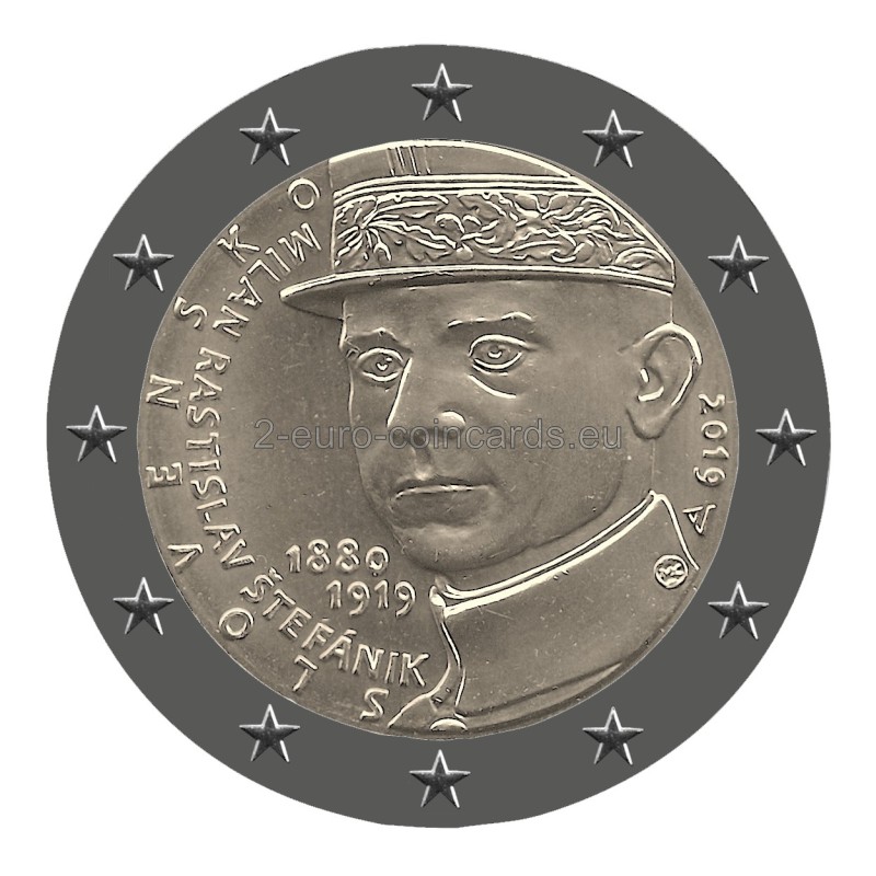 Na vyobrazení sa nachádza portrét Milana Rastislava Štefánika. Na ľavej strane portrétu sa nachádzajú dátumy narodenia a úmrtia Štefánika „1880“ a „1919“, jeden nad druhým. Na ľavej strane vnútornej časti mince je v polkruhu uvedené meno „MILAN RASTISLAV ŠTEFÁNIK“ a meno vydávajúcej krajiny „SLOVENSKO“. Rok vydania „2019“ sa nachádza medzi portrétom a pravou stranou. Pod rokom sú štylizované písmená „PV“, iniciály autora návrhu Petra Valacha, a pod nimi je značka Mincovne Kremnica, ktorá pozostáva z písmen „MK“ umiestnených medzi dvoma razidlami.