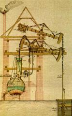 Hoci prvé pokusy o parný stroj pochádzajú z prvého storočia nášho letopočtu, prvé komerčné parné zariadenia vznikli vo Veľkej Británii koncom 18. storočia, kde sa para začala používať v baníctve. Avšak až vylepšenia Jamesa Watta viedli k jej masovému rozšíreniu. Už začiatkom 18. storočia vynálezca Thomas Newcomen navrhol prvý typ parného stroja. Na jeho pohon použil atmosférický tlak. Newcomenove stroje od začiatku poháňali čerpadlá v uhoľných a rudných baniach v Anglicku. Potom sa rýchlo rozšírili po celej Británii a čoskoro aj na európsky kontinent. Prvé desaťročia 18. storočia boli v uhorských (a Slovensko bolo v tom čase súčasťou Uhorského kráľovstva) banských mestách poznačené neustálymi problémami so spodnou vodou a tiež hľadaním riešenia na jej odčerpávanie. Práve v tomto období sa na viedenský dvor obrátil vtedy málo známy Angličan Isaac Potter s pomerne lacným návrhom na odčerpávanie podzemnej vody z baní pomocou parnej energie. Rozhodnutie postaviť parný stroj nakoniec prijal sám cisár Karol VI., ktorý súhlasil s vyskúšaním Potterovho návrhu napriek námietkam svojich dvorných poradcov. Po preskúmaní a zhodnotení možností v bani Windschacht (dnešné Štiavnické Bane) si vybral menšiu baňu Altandel v Nových Bahnách, ktorá bola v tom čase zatopená. Samotná výstavba strojného zariadenia sa začala v septembri 1721 a bola nielen nákladná, ale predstavovala aj množstvo prekážok, čo sa prejavilo v značnom oneskorení samotných prác. Parný stroj postavil Isaac Potter na verejné náklady. Po mnohých skúškach uviedol stroj do prevádzky v roku 1722, ale pre jeho nestabilnú prevádzku ho musel v roku 1724 upraviť dvorný architekt Fischer von Erlach. Po úspešnom uvedení parného stroja do prevádzky ho štát prenajal novej banskej spoločnosti, ktorej Dvorská komora povolila ťažbu v miestnych baniach a odpustila poplatok za vyťaženú rudu na 5 rokov. Vďaka šikovnej propagácii stroja a bohatstvu rudy v Novej Bani sa banský priemysel rozrástol a cena jeho akcií prudko stúpla. Potter mal na starosti čerpací stroj a jeho partner a neskôr švagor Gene Grill Costebadi bol povereným riaditeľom banskej spoločnosti. V prvých rokoch stroj prečerpával približne 23 000 litrov vody denne. Existovali dokonca plány na výstavbu druhého stroja. Baňa však prestala byť zisková a navyše Costebadi utiekol s pokladnicou bane ešte pred uplynutím prvých piatich rokov. To spolu s prevádzkovými problémami banskej spoločnosti viedlo k bankrotu tohto banského podniku a väčšinu baní prevzal štát a mesto. V polovici roku 1729 prestal stroj čerpať vodu a hlbinné vrty horizonty boli opustené a zatopené. Čerpací stroj bol v Novej Bani v prevádzke len sedem rokov. Zostal tam však ešte tri roky a Isaac Potter na ňom vykonával pokusy, pričom ako palivo používal uhlie. Jeho prvý stroj bol neskôr prenajatý súkromnej banskej spoločnosti v Chodruse, odkiaľ mal byť neskôr premiestnený do Banskej Štiavnice, ale pravdepodobne sa tak nestalo. Isaac Potter a Fischer von Erlach následne až do svojej smrti stavali parné stroje v Štiavnickej Bani. V rokoch 1733 až 1734 postavili dva čerpacie stroje v bani Jozef a hneď nato ďalšie dva v susednej bani Magdaléna. Piaty stroj postavil Fischer už po Potterovej smrti vo februári 1735.
