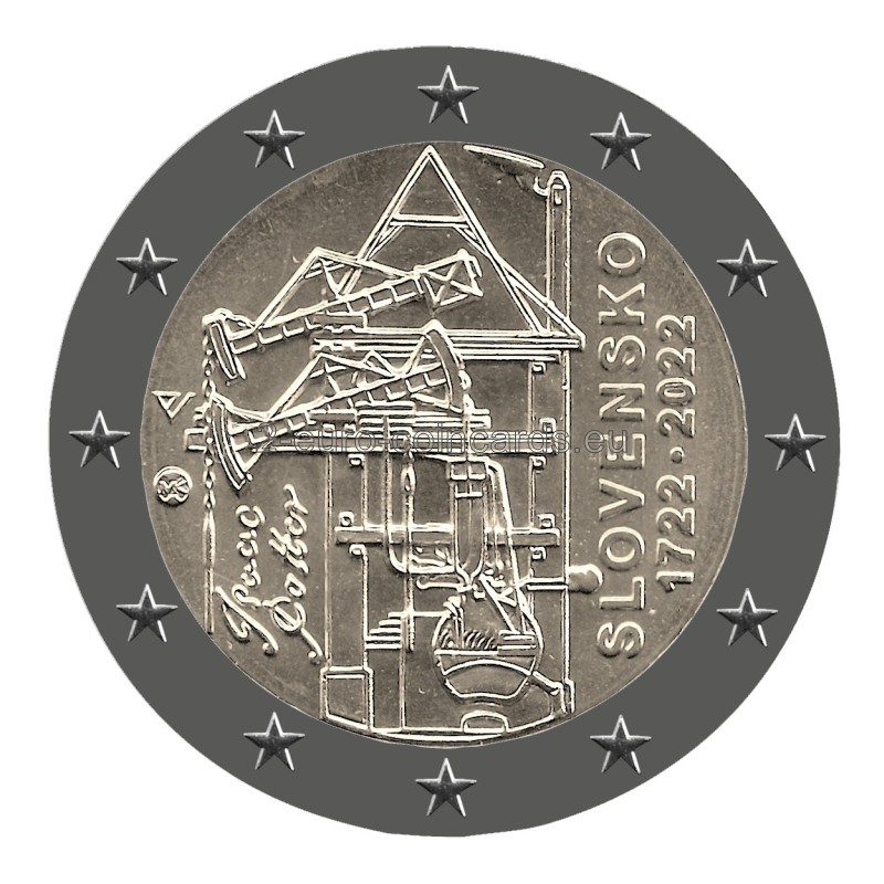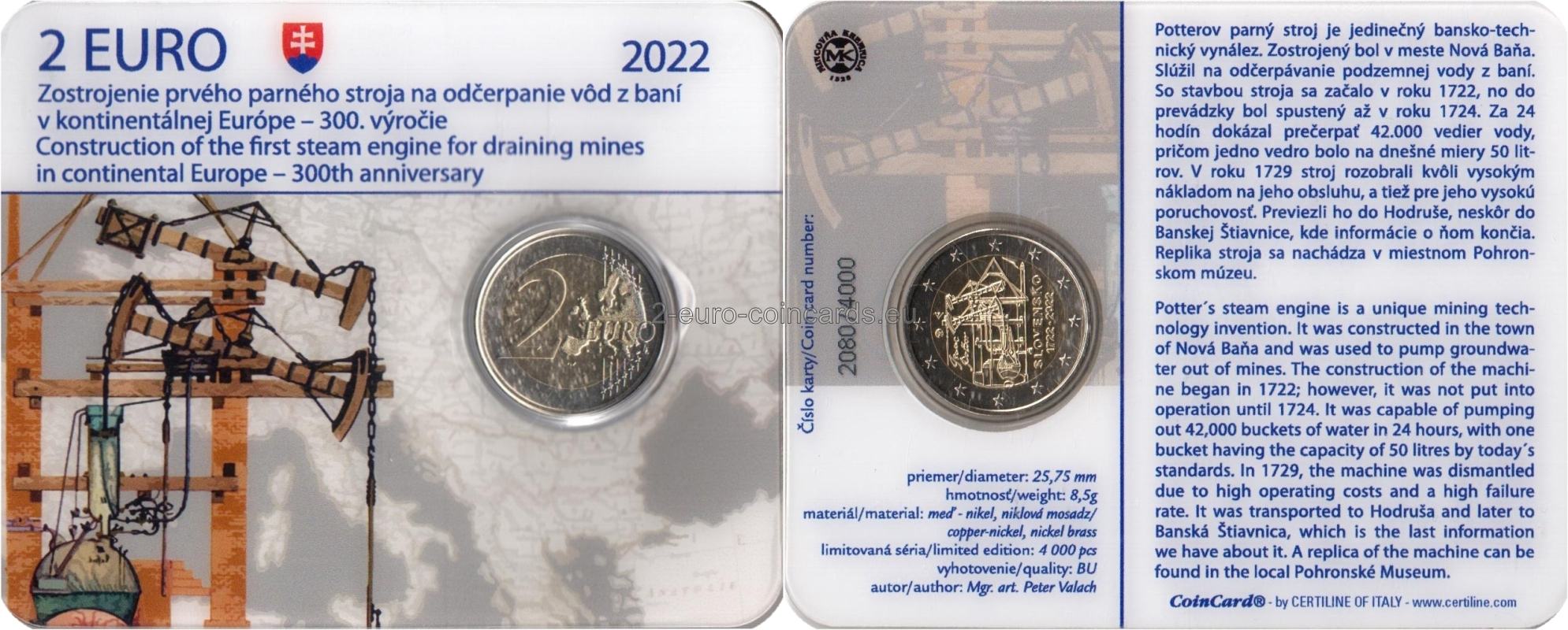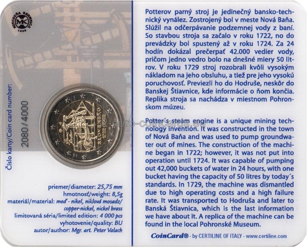 Vzor zobrazuje parný stroj na odčerpanie vôd z baní, ktorý bol zostrojený v roku 1722 v banskom meste Nová Baňa ako prvý svojho druhu v kontinentálnej Európe. Stroj navrhol a zostrojil anglický inžinier Isaac Potter, ktorého presná kópia podpisu je umiestnená v dvoch zvislých riadkoch v ľavej dolnej časti vzoru. Vpravo od stroja je opäť zvisle uvedený názov vydávajúcej krajiny „SLOVENSKO“ a napravo od neho sa nachádzajú roky „1722“ a „2022“ oddelené bodkou. Pri ľavom okraji vnútorného kruhu je pod sebou umiestnená značka Mincovne Kremnica, ktorá je tvorená písmenami „MK“ umiestnenými medzi dvoma razidlami, a štylizované iniciálky autora vzoru národnej strany euromince Petra Valacha.