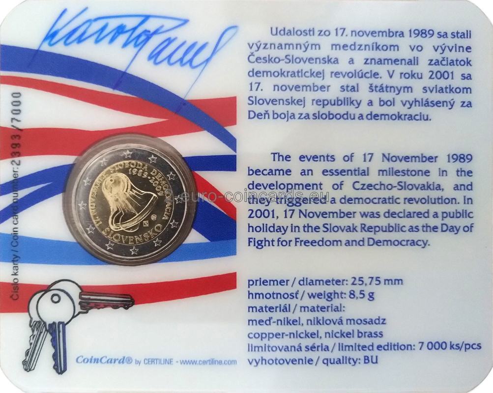 Vo vnútornej časti mince je vyobrazený štylizovaný zvon tvorený niekoľkými kľúčmi, ktorý pripomína demonštráciu zo 17. novembra 1989, počas ktorej občania kráčali a mávali kľúčmi na znak toho, že „odzvonilo“, čo bolo začiatkom „zamatovej revolúcie“. Vpravo pod týmto motívom je umiestnená značka umelca Pavel Károly (štylizované písmená "PK") a značka Mincovne Kremnica (skratka "MK" v kruhu). Motív je zhora obklopený nápisom „17. NOVEMBER SLOBODA – DEMOKRACIA“ a rokmi „1989 – 2009“ a v dolnej časti údajom o vydávajúcej krajine „SLOVENSKO“.