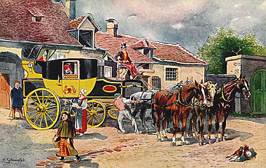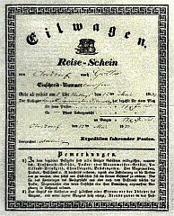 | Poštový kočiar z r. 1870 | Dobový cestovný lístok |