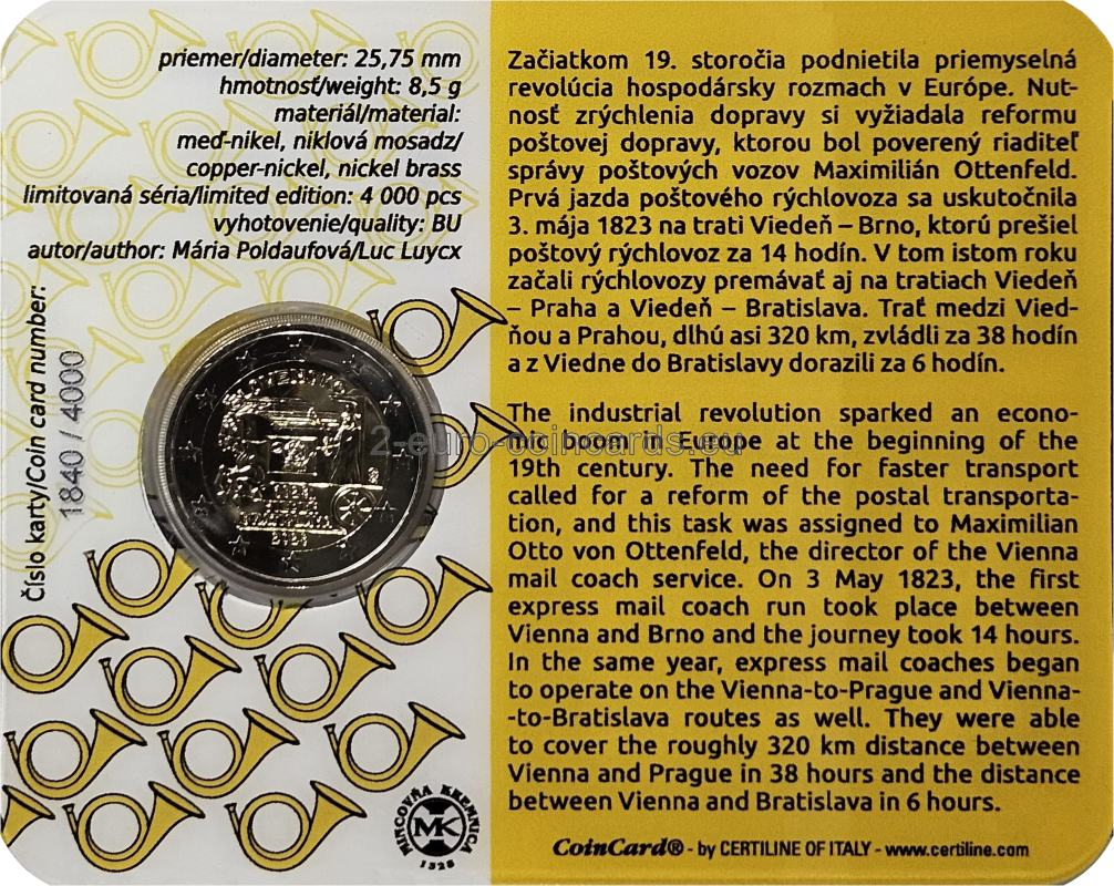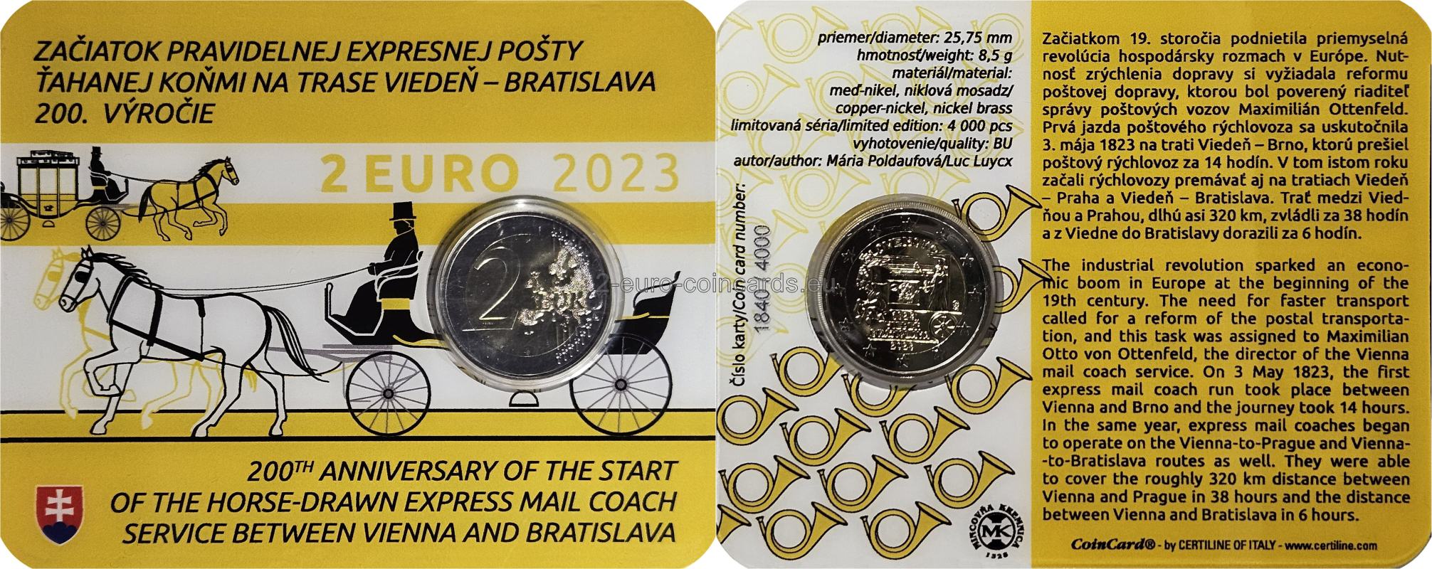 Na minci je symbolické vyobrazenie expresnej pošty ťahanej koňmi na trase Viedeň – Bratislava s motívom koňa ťahajúceho vozeň v rýchlom pohybe a obdĺžnikovým útvarom umiestneným v strede, v ktorom sa nachádza lesný roh. Pod obrázkom je uvedený rok „1823“, kedy začala prevádzka expresnej pošty ťahanej koňmi, a pod ním sa uvádzajú názvy miest v slovenskom jazyku „VIEDEŇ“ a „BRATISLAVA“, taktiež usporiadané pod sebou. V spodnej časti vnútorného kruhu mince je rok vydania „2023“, ktorý je od textu oddelený vodorovnou čiarou. Pozdĺž horného okraja motívu je umiestnený názov vydávajúcej krajiny „SLOVENSKO“. Na pravej strane motívu sa nachádza značka Mincovne Kremnica pozostávajúca z písmen „MK“ medzi dvoma razidlami. Tesne pod značkou sa nachádzajú štylizované iniciály autorky návrhu národnej strany mince Márie Poldaufovej „MP“.
