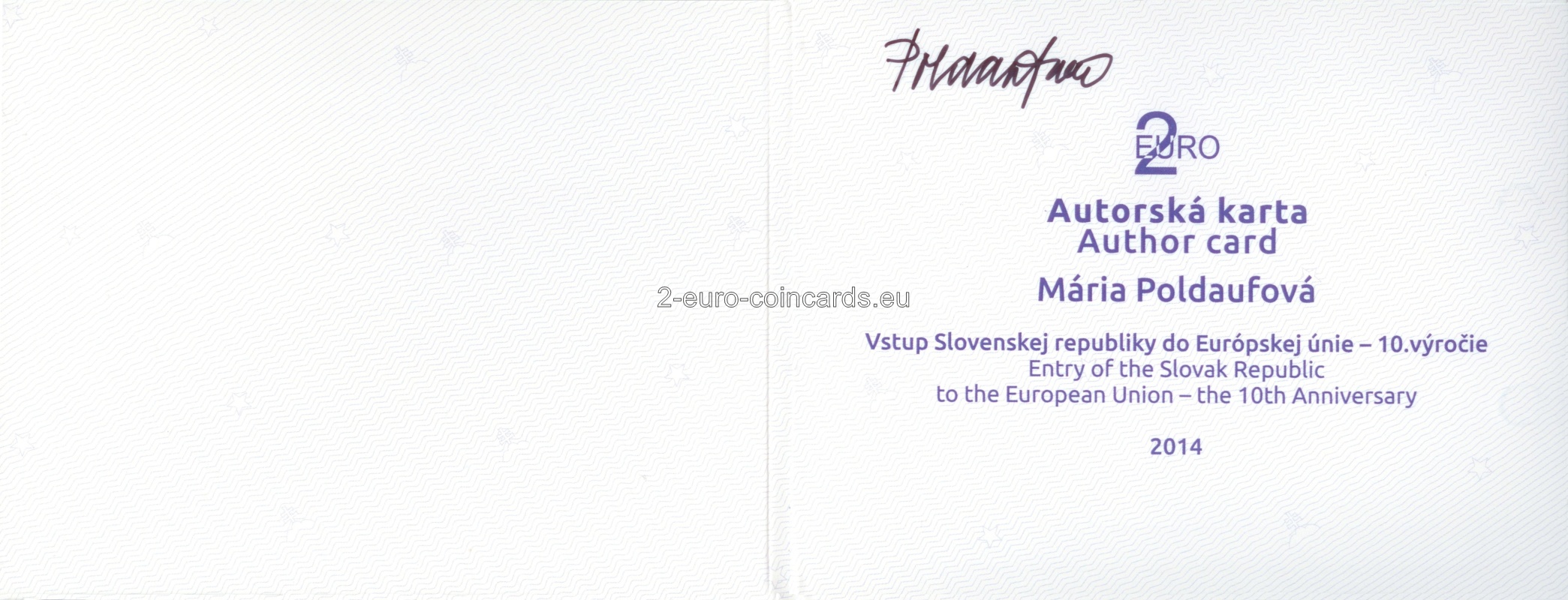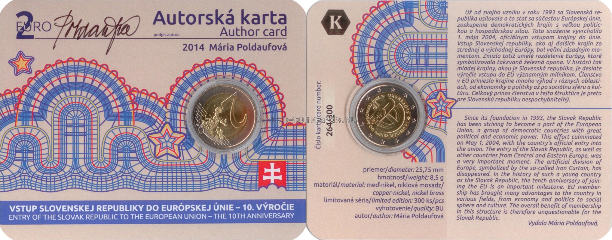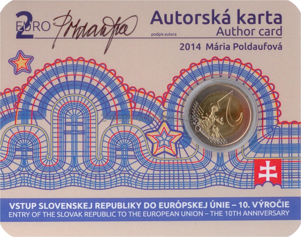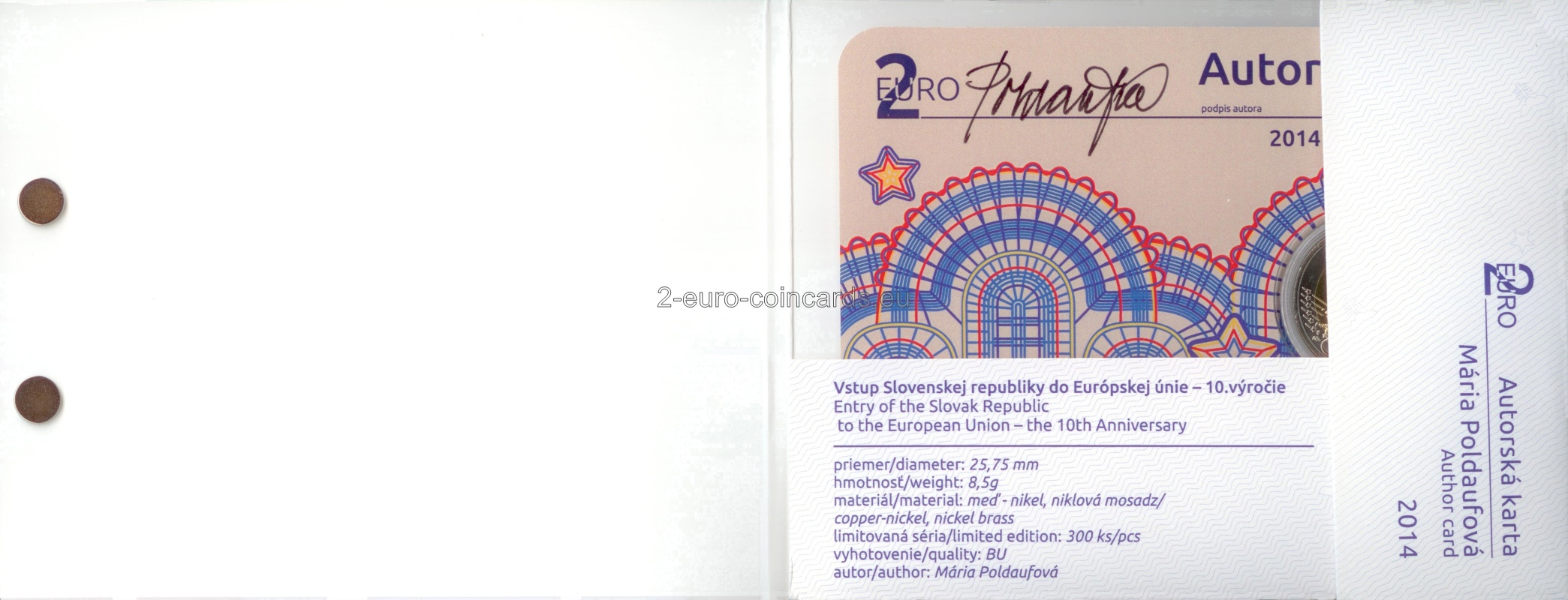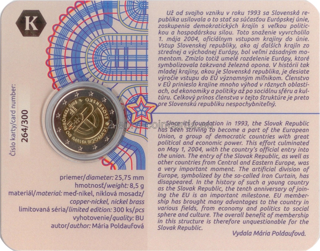 V strede národnej strany mince sú štylizované písmená „EÚ“ ako skratka výrazu Európska únia so štátnym znakom Slovenskej republiky, ktorý je začlenený do popredia. Na pravej strane vnútornej časti mince je v dvoch riadkoch vyobrazený dátum pristúpenia Slovenskej republiky k Európskej únii „1.5.2004“ a bezprostredne pod ním rok „2014“. Na dolnom okraji vnútornej časti mince sa nachádza vpísaný názov vydávajúcej krajiny „SLOVENSKO“, pričom na hornom okraji sú v polkruhu uvedené slová „10. VÝROČIE VSTUPU DO EURÓPSKEJ ÚNIE“. Vľavo dole je značka mincovne Kremnica (pozostávajúca z písmen „MK“ medzi dvoma razidlami) a vpravo dole sa nachádzajú štylizované písmená „MP“, ktoré sú iniciálkami autorky motívu Márie Poldaufovej.
