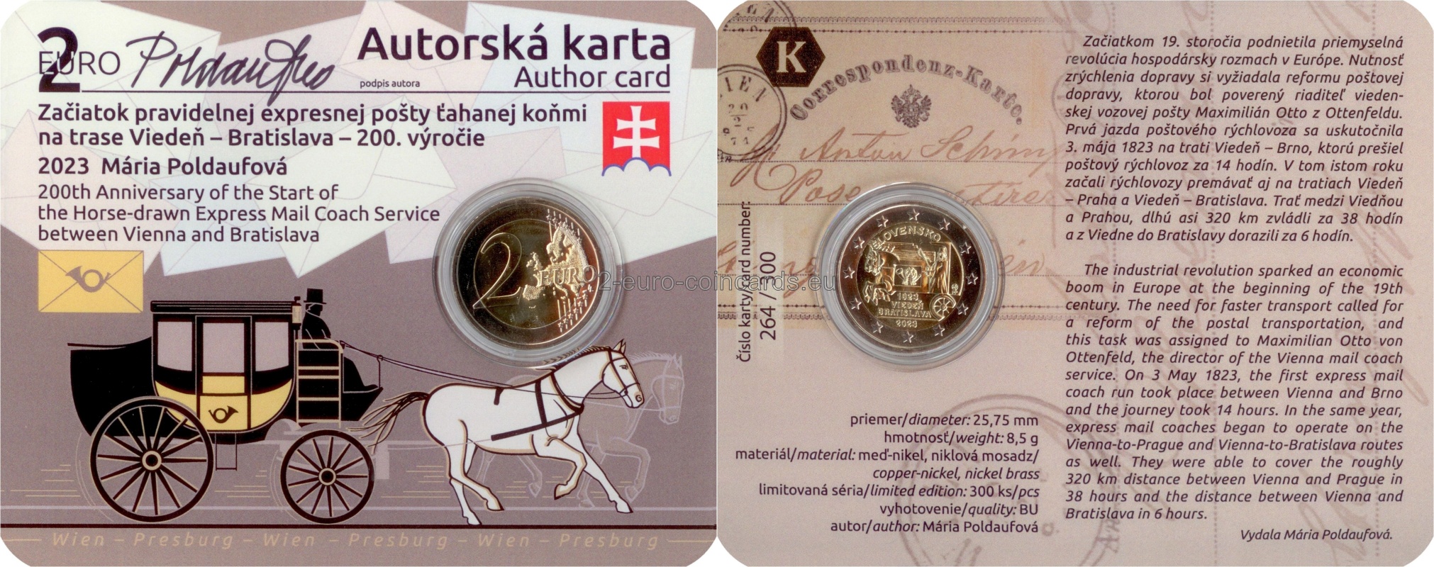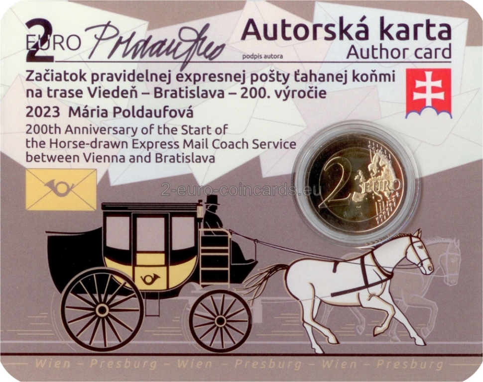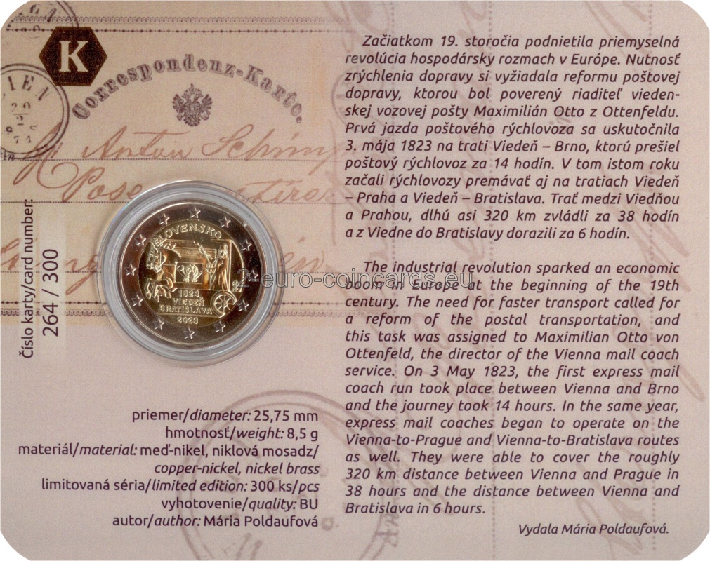 Na minci je symbolické vyobrazenie expresnej pošty ťahanej koňmi na trase Viedeň – Bratislava s motívom koňa ťahajúceho vozeň v rýchlom pohybe a obdĺžnikovým útvarom umiestneným v strede, v ktorom sa nachádza lesný roh. Pod obrázkom je uvedený rok „1823“, kedy začala prevádzka expresnej pošty ťahanej koňmi, a pod ním sa uvádzajú názvy miest v slovenskom jazyku „VIEDEŇ“ a „BRATISLAVA“, taktiež usporiadané pod sebou. V spodnej časti vnútorného kruhu mince je rok vydania „2023“, ktorý je od textu oddelený vodorovnou čiarou. Pozdĺž horného okraja motívu je umiestnený názov vydávajúcej krajiny „SLOVENSKO“. Na pravej strane motívu sa nachádza značka Mincovne Kremnica pozostávajúca z písmen „MK“ medzi dvoma razidlami. Tesne pod značkou sa nachádzajú štylizované iniciály autorky návrhu národnej strany mince Márie Poldaufovej „MP“.