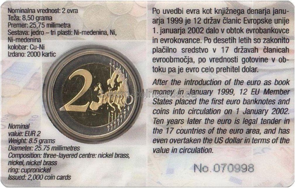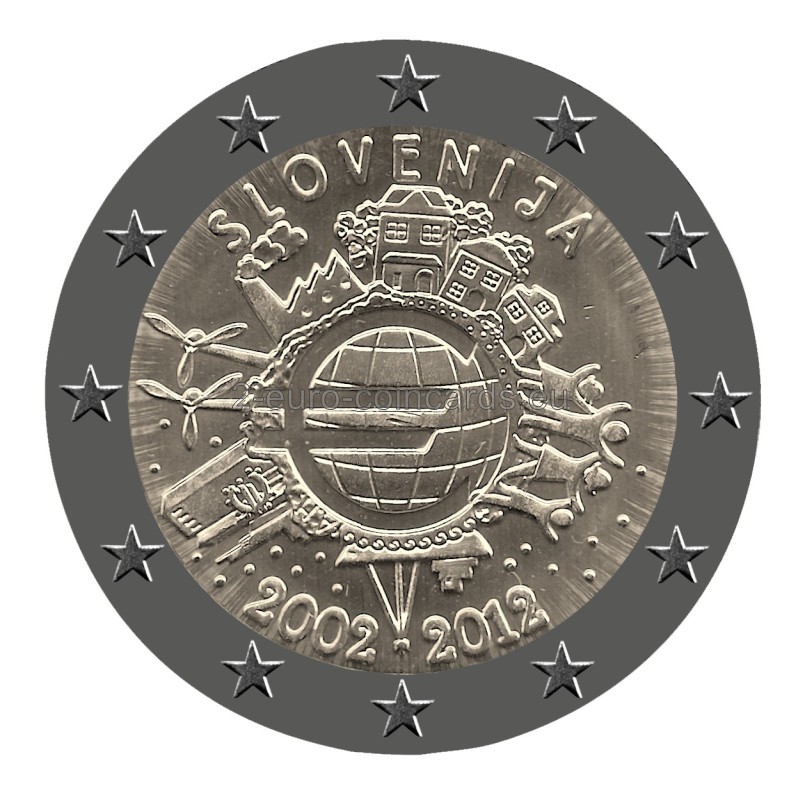 Znak eura v strede mince znamená, že euro sa stalo mimoriadne dôležitou súčasťou Európy, ale aj sveta, pretože sa v priebehu posledných 10 rokov stalo globálnym hráčom v rámci medzinárodného menového systému. Jednotlivé prvky motívu okolo symbolu eura na minci vyjadrujú význam eura pre ľudí, pre finančný svet (veža ECB), pre obchod (lode), priemysel (továrne), pre odvetvie energetiky, výskumu a vývoja (veterné elektrárne). Iniciály autora návrhu „A.H.“ sa dajú objaviť (ak sa pozriete veľmi pozorne) medzi loďou a budovou Eurotower. Pozdĺž horného okraja vnútornej časti mince je uvedená krajina vydania (SLOVENIJA), zatiaľ čo označenie 2002 – 2012 je umiestnené v dolnej časti.