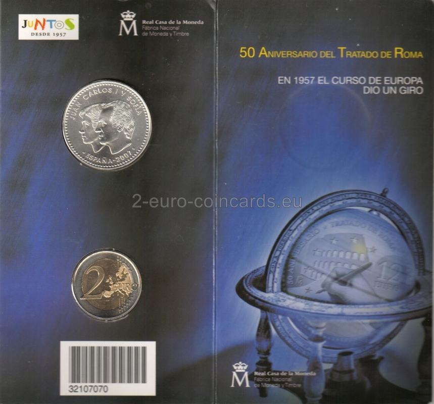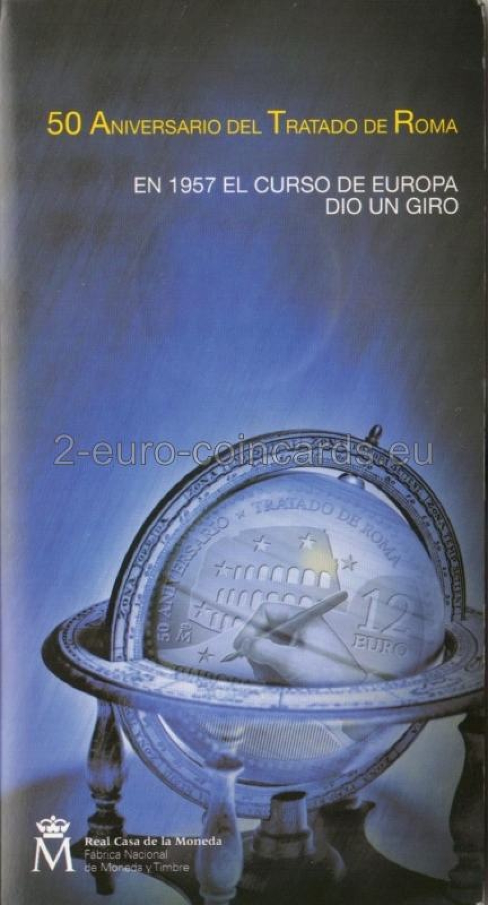 Dňa 25. marca 1957 bola podpísaná Rímska zmluva, udalosť, ktorá zmenila smerovanie Európy. Zmluva, ktorá dala podnet na vytvorenie novej, silnejšej a vyspelejšej Európy. Európu plnú zmien, v ktorej sa všetko a všetci uberajú rovnakým smerom. Pri príležitosti 50. výročia podpísania Rímskej zmluvy vyrazila španielska kráľovská mincovňa striebornú mincu s rýdzosťou 925 v hodnote 12 eur a pamätnú mincu v hodnote 2 eur. Mince predstavujú vývoj, budúcnosť, pokrok a jednotu.