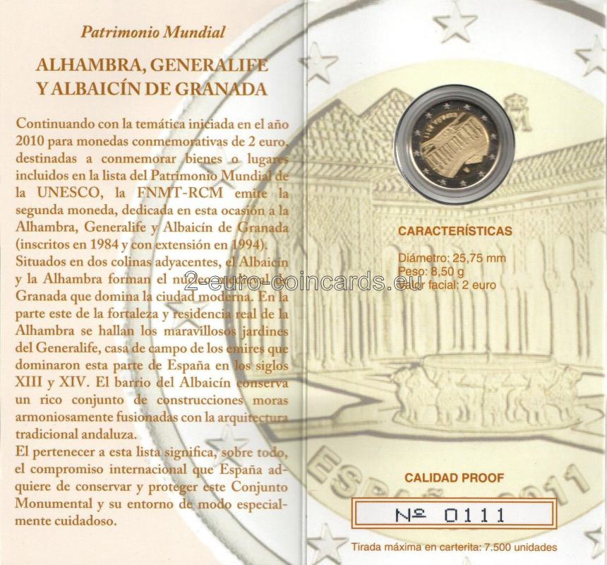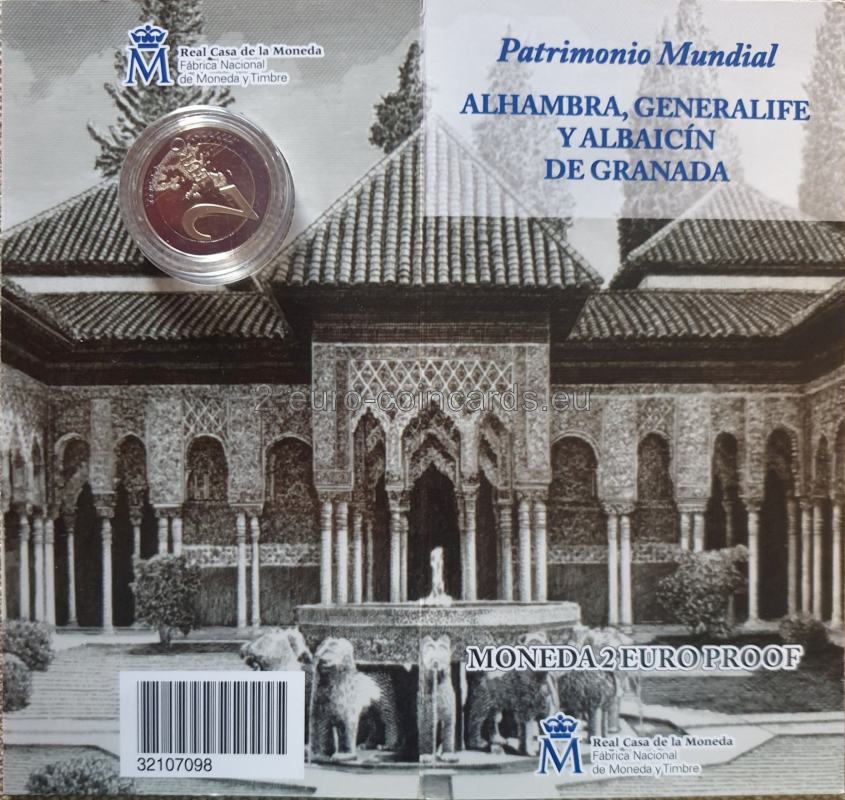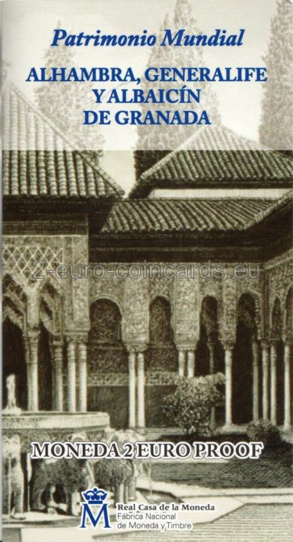 Pokračujúc v téme pamätných mincí v hodnote 2 eur, ktoré boli iniciované v roku 2010 na pripomenutie objektov alebo miest zapísaných do Zoznamu svetového dedičstva UNESCO, FNMT-RCM (Fábrica Nacional de Moneda y Timbre - Real Casa de la Moneda) vydáva druhú mincu, ktorá je pri tejto príležitosti venovaná Alhambre, Generalife a Albaicínu v Granade (zapísané v roku 1984 a rozšírené v roku 1994). Albaicín a Alhambra sa nachádzajú na dvoch susedných kopcoch a tvoria stredoveké jadro Granady, ktoré dominuje modernému mestu. Na východnej strane pevnosti a kráľovského sídla Alhambra sa nachádzajú nádherné záhrady Generalife, vidieckeho sídla emirov, ktorí vládli tejto časti Španielska v 13. a 14. storočí. Štvrť Albaicín uchováva bohatú zbierku maurských stavieb harmonicky zmiešaných s tradičnou andalúzskou architektúrou. Jej zaradenie do tohto zoznamu znamená predovšetkým medzinárodný záväzok Španielska zachovať a chrániť túto pamiatkovú lokalitu a jej okolie s osobitnou starostlivosťou.