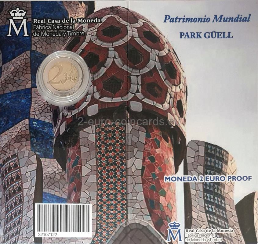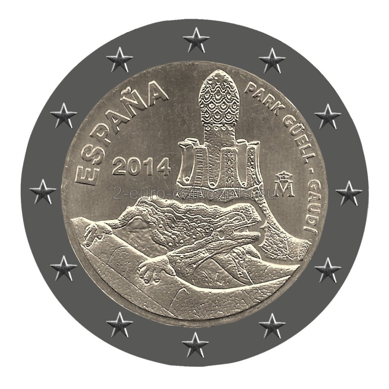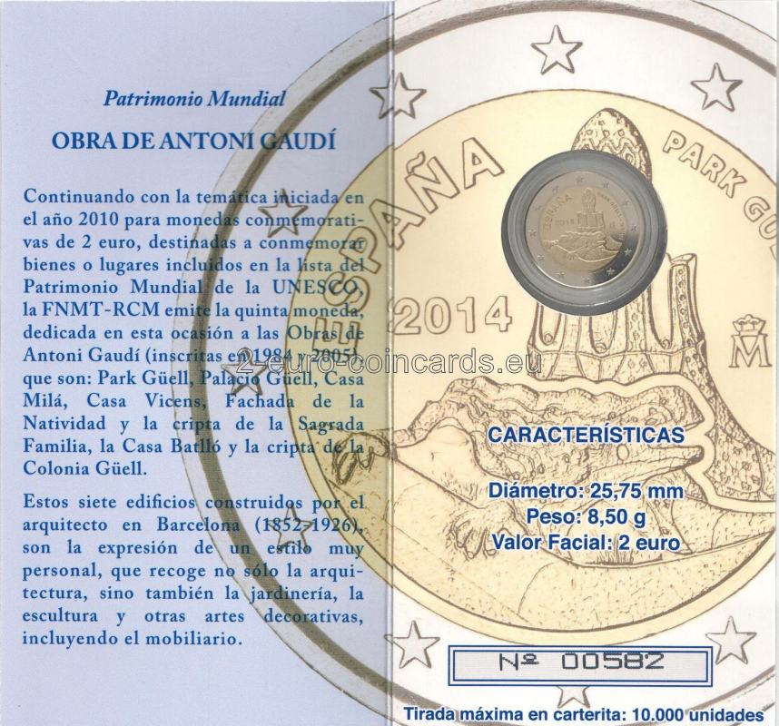 Pokračujúc v téme pamätných mincí v hodnote 2 eur, ktoré boli iniciované v roku 2010 a sú určené na pripomenutie tovarov alebo miest zapísaných na zoznam svetového dedičstva UNESCO, FNMT-RCM (Fábrica Nacional De Moneda Y Timbre - Real Casa De La Moneda) vydáva piatu mincu, ktorá je pri tejto príležitosti venovaná dielam Antoniho Gaudího (zapísaným v rokoch 1984 a 2005), ktorými sú: Park Güell, Palau Güell, Casa Milà, Casa Vicens, fasáda Nativity a krypta Sagrada Família, Casa Batló a krypta Colonia Güell. Týchto sedem budov, ktoré architekt postavil v Barcelone (1852 - 1926), je výrazom veľmi osobného štýlu, ktorý zahŕňa nielen architektúru, ale aj záhradníctvo, sochárstvo a iné dekoratívne umenie vrátane nábytku.