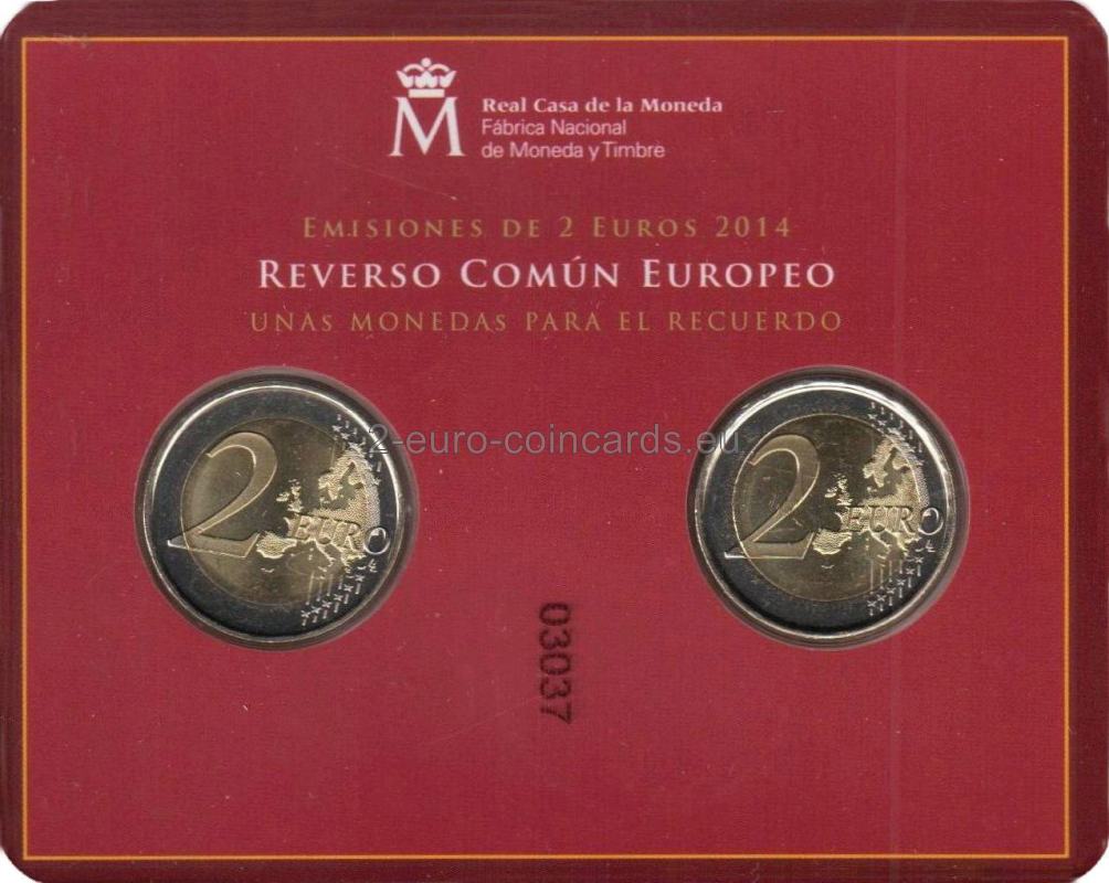 Na minci sú vyobrazené prekrývajúce sa portréty kráľa Felipeho VI. a kráľa Juana Carlosa I. V spodnej časti mince je uvedený názov vydávajúcej krajiny a rok vydania: „ESPAÑA – 2014“. Vpravo je značka mincovne (korunované písmeno "M").