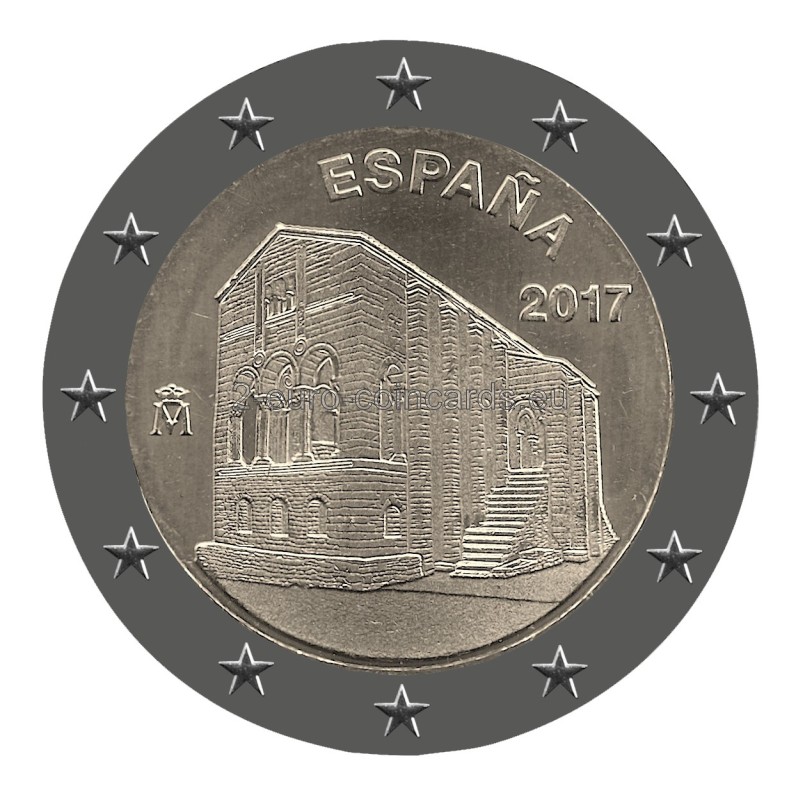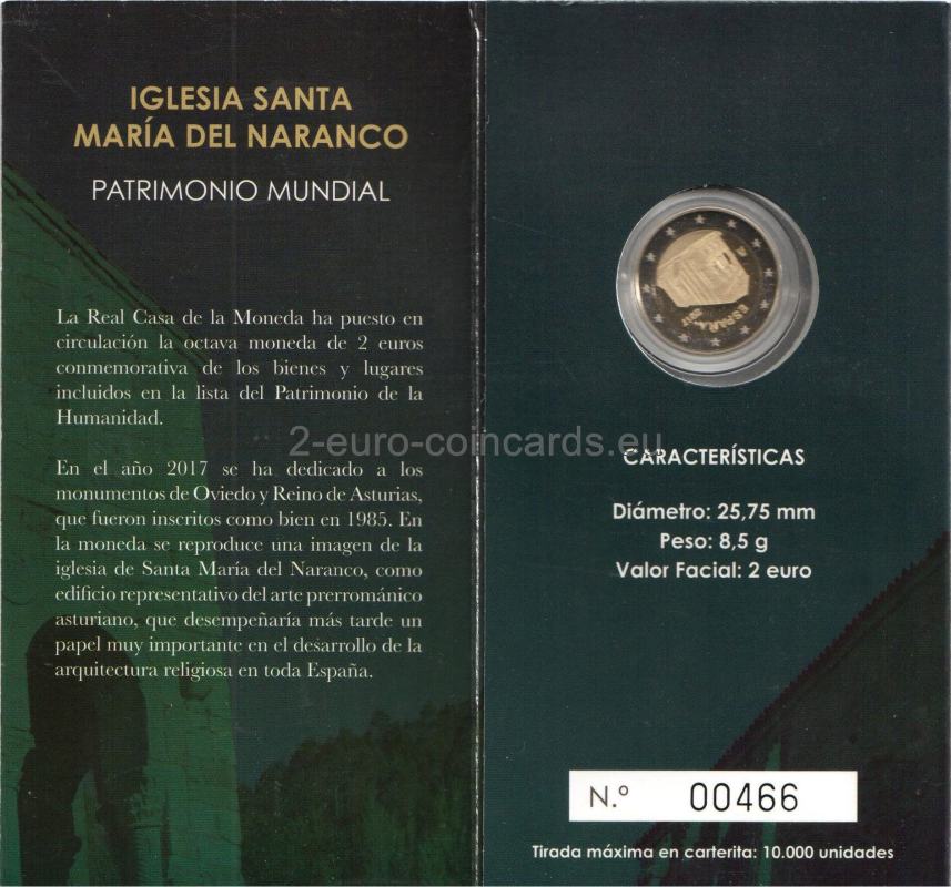 Španielska kráľovská mincovňa dala do obehu ôsmu 2-eurovú mincu pripomínajúcu objekty a miesta zaradené do Zoznamu svetového dedičstva. V roku 2017 je minca venovaná pamiatkam v Oviede a Astúrskom kráľovstve, ktoré boli zapísané v roku 1985. Na minci je vyobrazený kostol Santa María del Naranco ako reprezentatívna stavba asturského predrománskeho umenia, ktorá neskôr zohrala veľmi dôležitú úlohu vo vývoji sakrálnej architektúry v celom Španielsku.