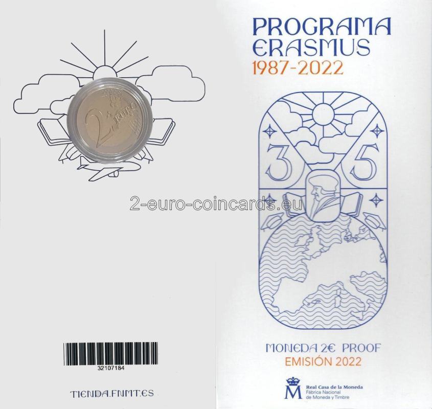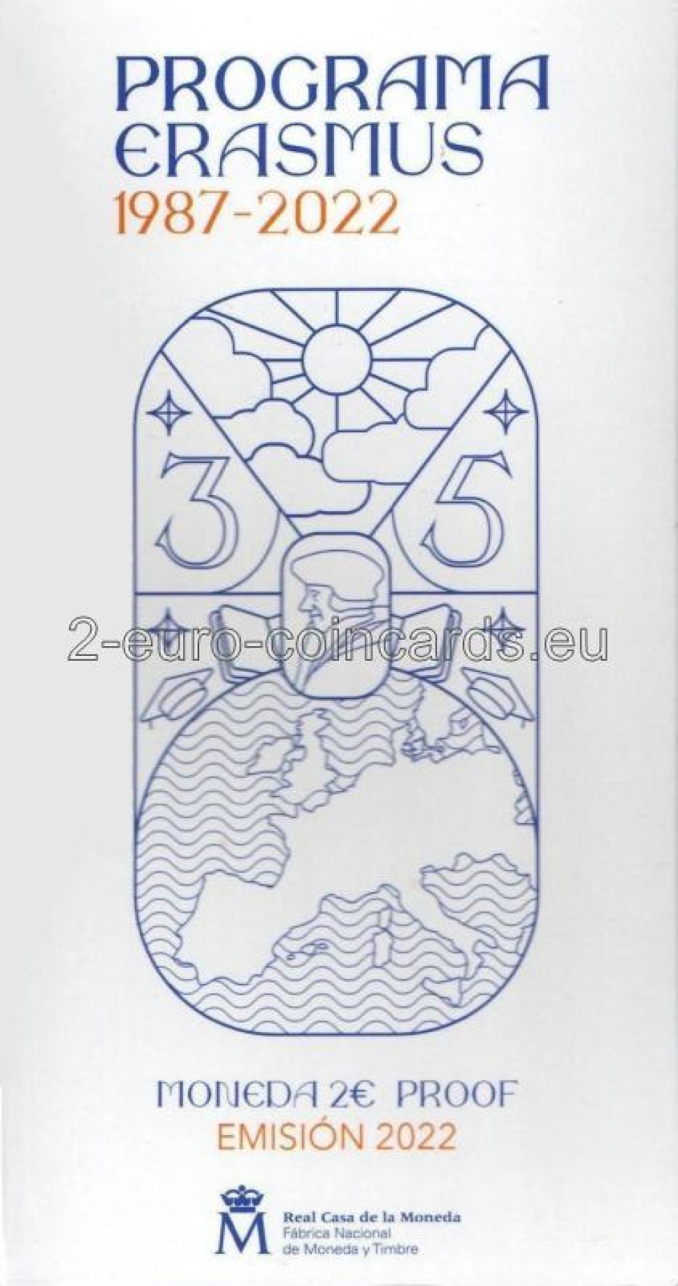 FNMT-RCM (Fábrica Nacional De Moneda Y Timbre - Real Casa De La Moneda) si v roku 2022 pripomína 35. výročie programu Erasmus, akronym oficiálneho názvu v angličtine European Region Action Scheme for the Mobility of University Students (Akčný plán Európskeho spoločenstva pre mobilitu vysokoškolských študentov). Európsky program, ktorý podporuje vzdelávaciu mobilitu študentov, ako aj spoluprácu, kvalitu, inklúziu a rovnosť, excelentnosť, tvorivosť a inovácie prostredníctvom celoživotného vzdelávania, vzdelávací, profesionálny a osobnostný rozvoj jednotlivcov v oblasti vzdelávania a odbornej prípravy, mládeže a športu v rámci Európy, posilňovanie európskej identity, aktívne občianstvo a účasť na demokratickom živote.