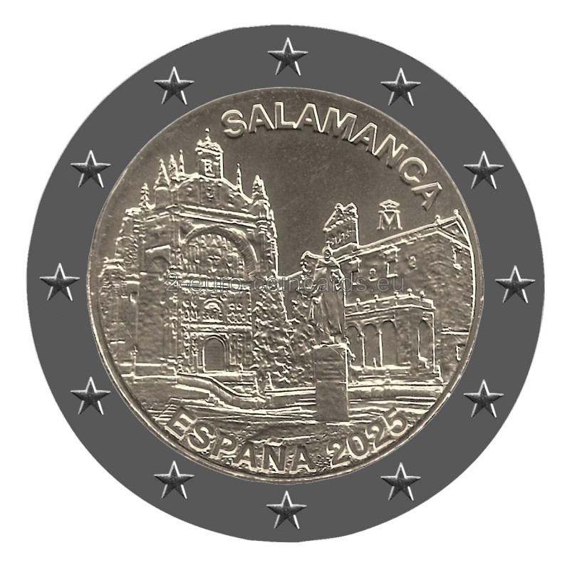 Na lícnej strane mince je detailný pohľad na staré mesto Salamanca. V strede je zreteľne vidieť zdobené priečelie kostola San Esteban, skvostu platereskej architektúry. Napravo od kostola je viditeľná aj veža dominikánskeho kláštora. V popredí majestátne stojí socha, ktorá vzdáva hold intelektuálnej a umeleckej histórii mesta. Celok je obklopený stromami, V hornej časti mince sa číta nápis „SALAMANCA“. V spodnej časti je nápis „ESPAÑA 2025“ označujúci vydávajúcu krajinu a rok razby. Na pravej strane sa nachádza značka mincovne Fabrica Nacional de Moneda y Timbre Real Casa de la Moneda - písmeno „M" s korunkou.