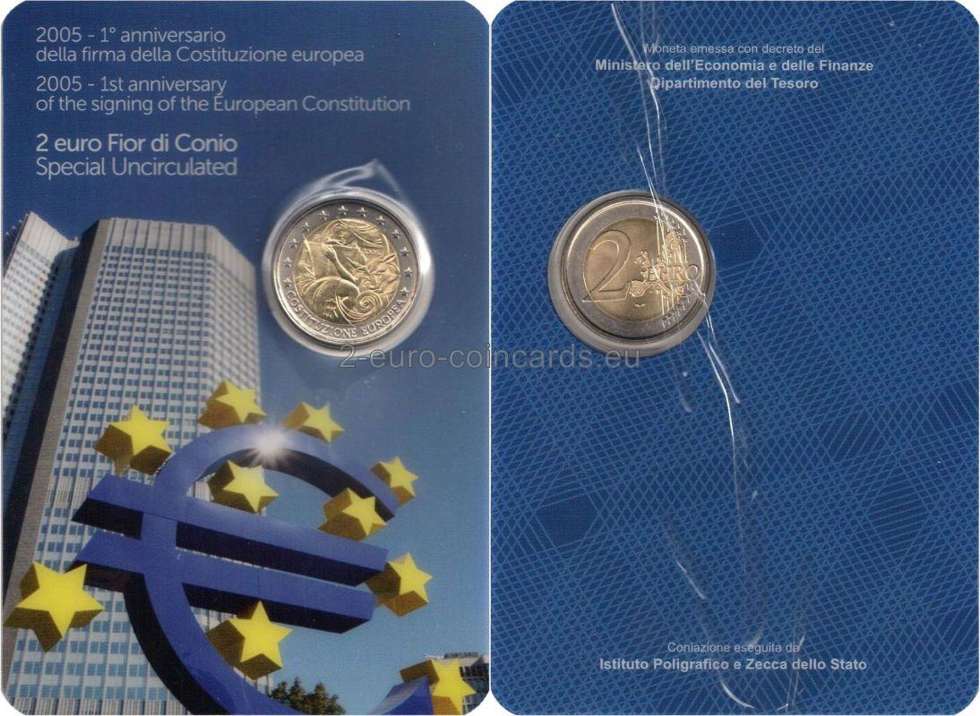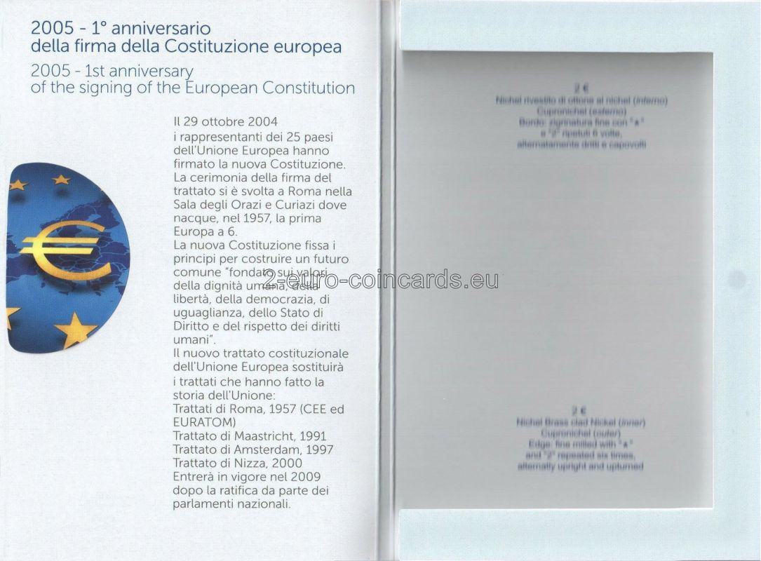 Vo vnútornej časti mince je vyobrazená Európa a býk. Európa drží pero a text európskej ústavy. V hornej ľavej časti vzoru mince sa nachádza značka mincovne „R“. Vľavo dole sú iniciály autorky rytiny Marie Carmely Colaneriovej „MCC“. Rok razenia je umiestnený v hornej pravej časti vzoru nad hlavou býka. V dolnej časti vzoru mince je monogram Talianskej republiky „RI“. Slová „COSTITUZIONE EUROPEA“ vytvárajú polkruh na dolnom vonkajšom okraji mince.