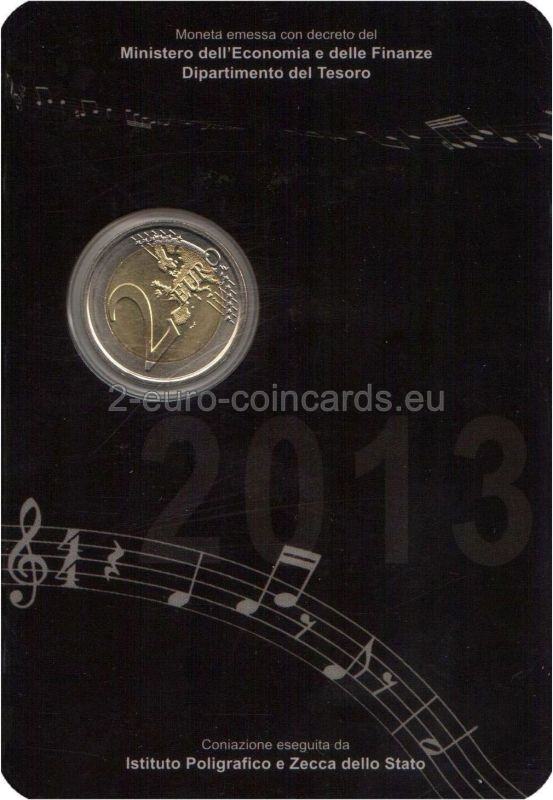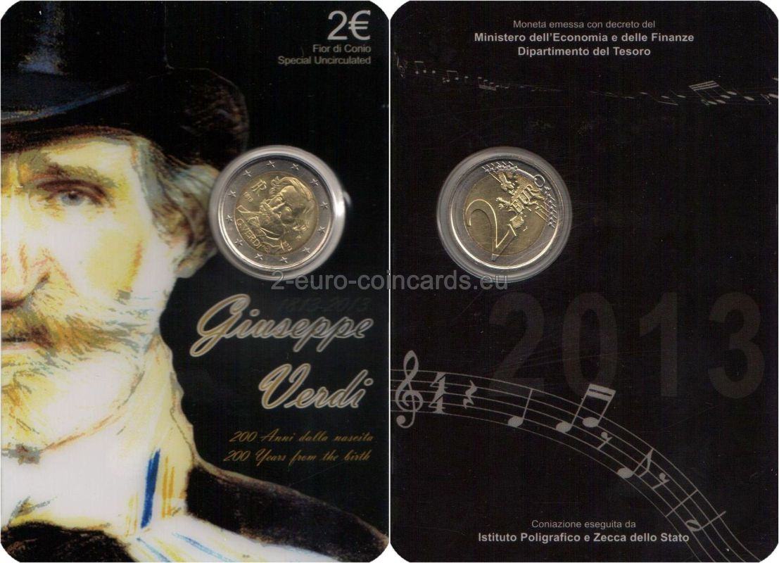 Vzor znázorňuje bustu Giuseppeho VERDIHO v trojštvrtinovom profile otočenú doľava; na ľavej strane zväčšené písmená monogramu Talianskej republiky „RI“/1813; na pravej strane písmeno R (monogram mincovne v Ríme)/2013; na spodnej časti mince sa nachádzajú písmená MCC (monogram mena autorky Marie Carmely COLANERIOVEJ)/G. VERDI.
