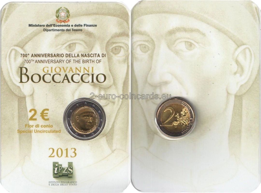 Vzor znázorňuje hlavu Giovanniho BOCCACCIA v trojštvrtinovom profile otočenú doprava, ktorá bola nakreslená podľa fresky autora Andreu del Castagna okolo roku 1450 (Florencia, Galleria degli Uffizi); v spodnej časti je nápis BOCCACCIO 1313 2013; na pravej strane zväčšené písmená R (monogram mincovne v Ríme)/RI (monogram Talianskej republiky)/m (monogram autora Mauriho).