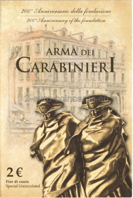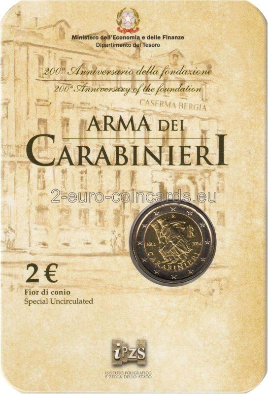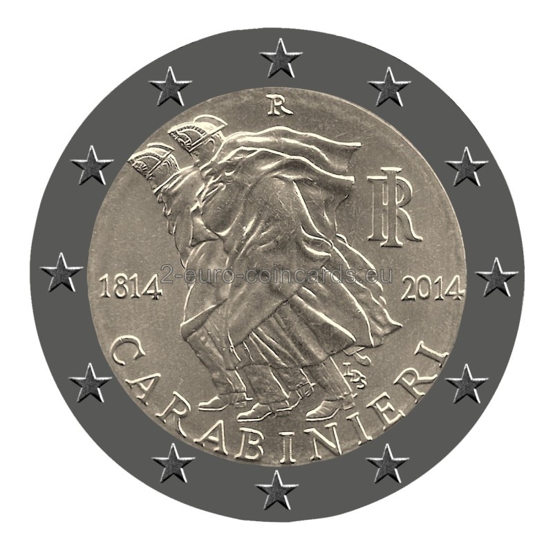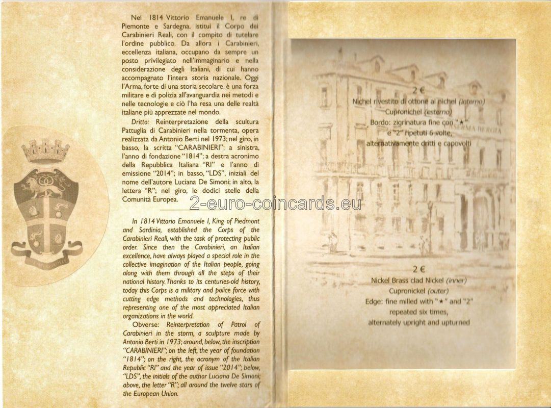 Averz: Reinterpretácia hliadky karabinierov v búrke, socha, ktorú vytvoril Antonio Berti v roku 19 73; okolo, dole, nápis "CARABINIERI"; vľavo rok založenia "1814"; vpravo skratka Talianskej republiky "RI" a rok vydania "2014"; dole. "LDS" iniciály autora Luciana De Simoniho, nad nimi písmeno "R"; všetko okolo dvanásťcípej hviezdy, Európskej únie.