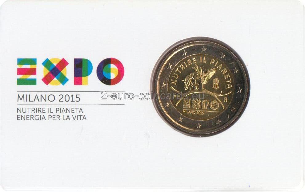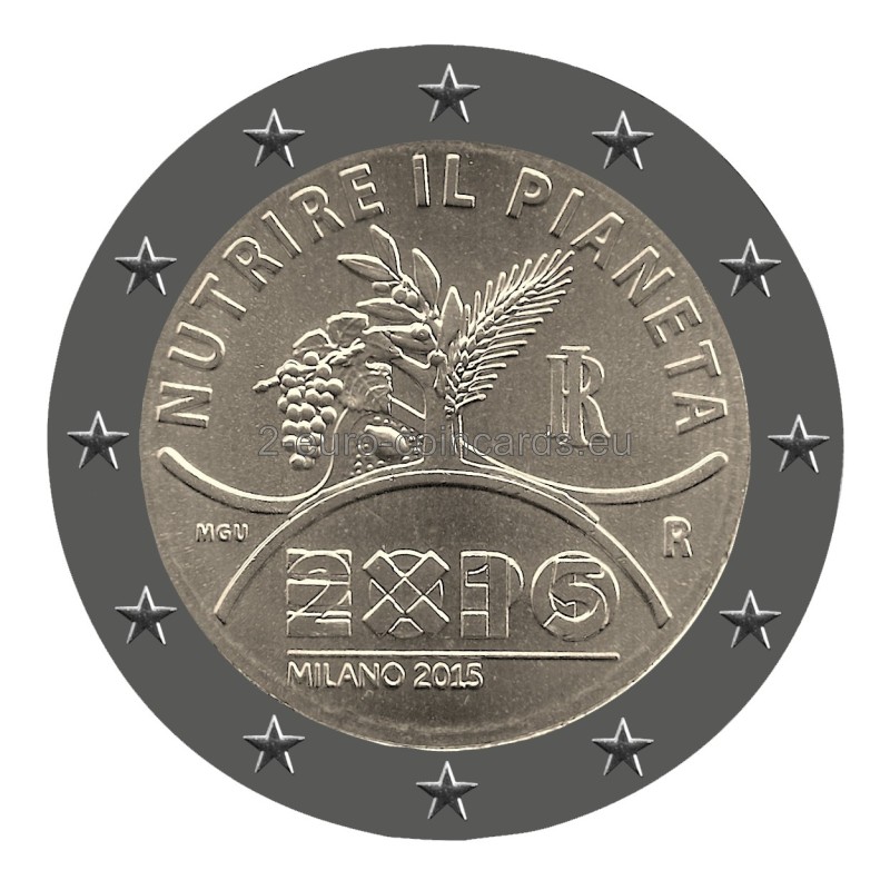 Na obraze je znázornená kompozícia symbolizujúca plodnosť Zeme: na polkruhu predstavujúcom zemeguľu sa chystá vyklíčiť vodou zalievané semeno. Nad Zemou z kmeňa stromu vyrastá vinič, olivová ratolesť a obilný klas. Obklopuje ich nadpis „NUTRIRE IL PIANETA“. Vľavo sa nachádzajú iniciály grafičky Márie Grazie Urbaniovej „MGU“. Vpravo sa nachádza monogram Talianskej republiky „RI“ a monogram rímskej mincovne „R“. V strede je vyobrazené logo EXPO MILANO 2015.
