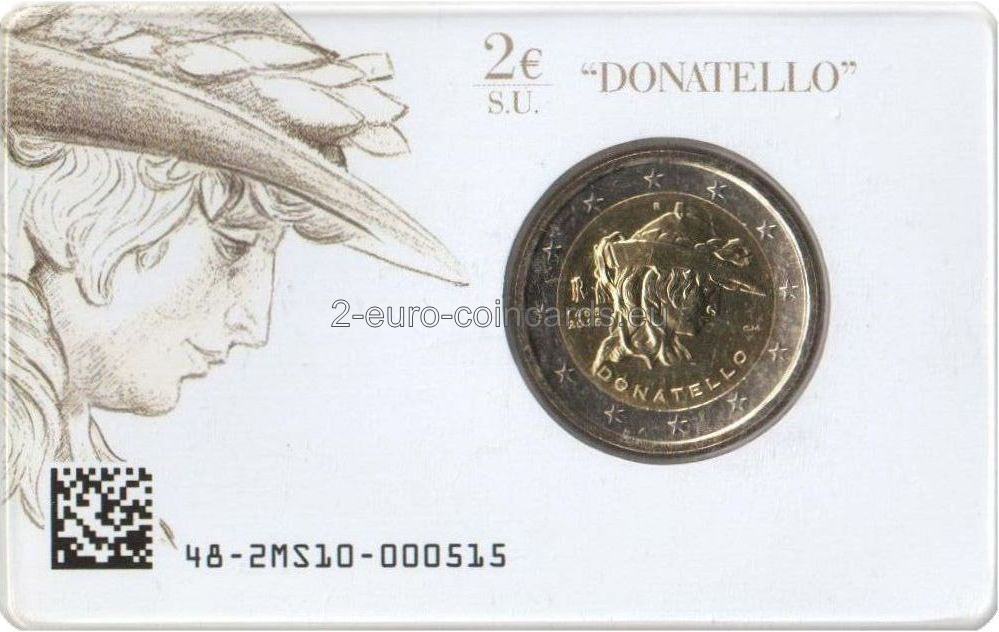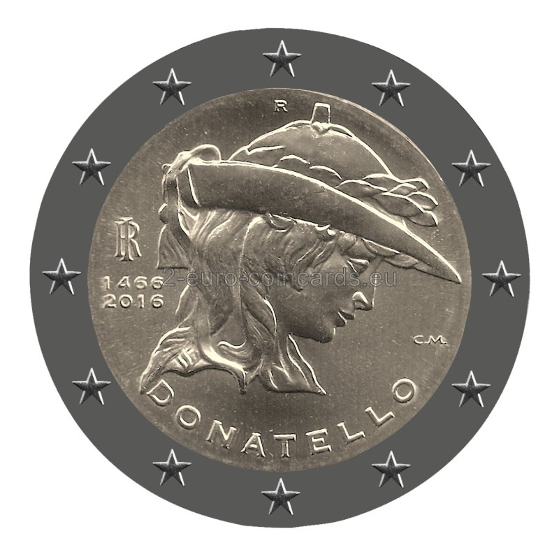 Na minci je zobrazená hlava Dávida od Donatella (detail bronzovej sochy vystavenej v Národnom múzeu Bargello vo Florencii). Naľavo od nej sa nachádza monogram Talianskej republiky „RI“ a pod ním v dvoch riadkoch roky „1466“ a „2016“. V pravej časti mince sú uvedené iniciálky autorky Claudie Momoniovej „C.M.“ a v spodnej časti mince nápis „DONATELLO“.
