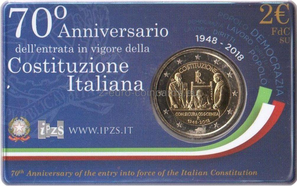Enrico De Nicola, dočasná hlava štátu, podpisuje 27. decembra 1947 vyhlásenie ústavy Talianskej republiky. Po jeho pravici stojí predseda vlády Alcide de Gasperi, po jeho ľavici Umberto Terracini, predseda ústavodarného zhromaždenia Talianska. Nad nimi je uvedený nápis „COSTITUZIONE“ a monogram Talianskej republiky „RI“. V dolnej časti sa nachádza nápis „CON SICURA COSCIENZA“, „R“, značka mincovne v Ríme, a dátumy „1948 • 2018“, z ktorých prvý označuje rok nadobudnutia platnosti talianskej Ústavy a druhý znamená rok vydania mince.