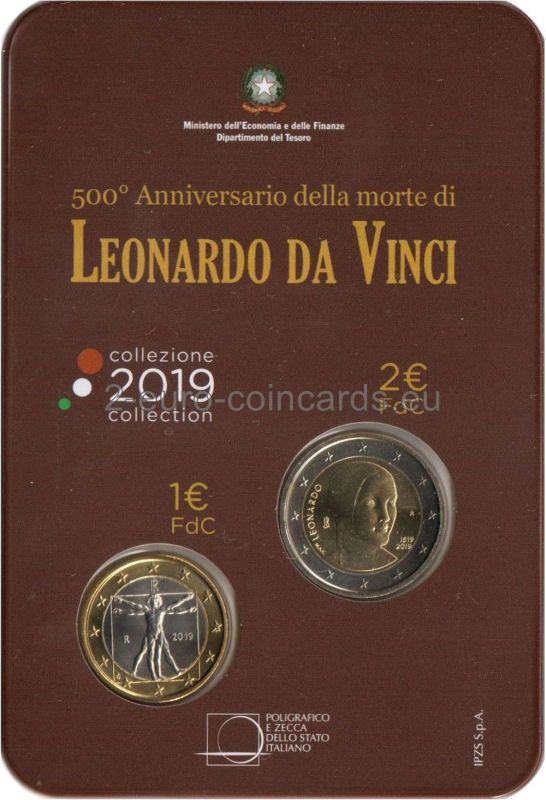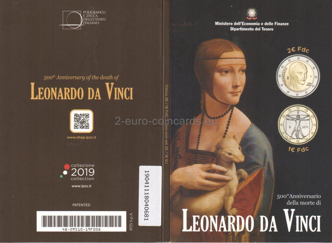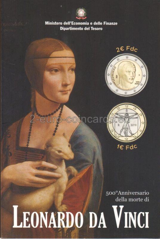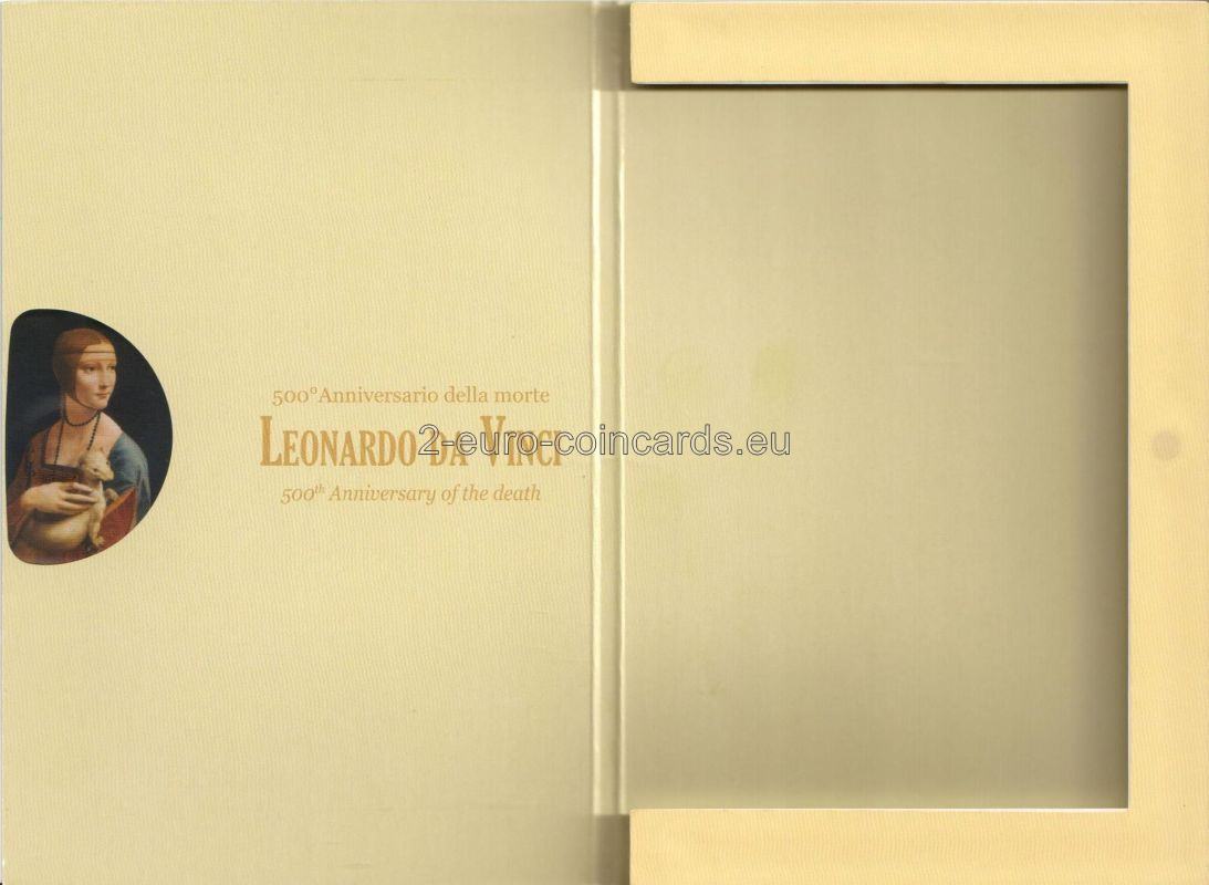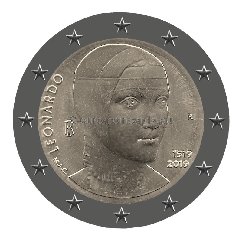 Minca zachytáva detail maľby Leonarda da Vinci „Dama con l’ermellino“ (Dáma s hranostajom, Národné múzeum v Krakove). Vľavo sa nachádza nápis „LEONARDO“, iniciály autorky Marie Angely Cassolovej „MAC“ a skratka Talianskej republiky „RI“. Vpravo je značka rímskej mincovne „R“ a letopočty 1519 a 2019, teda rok Leonardovho úmrtia a rok vydania mince.