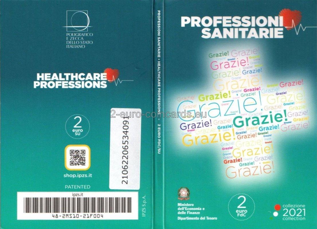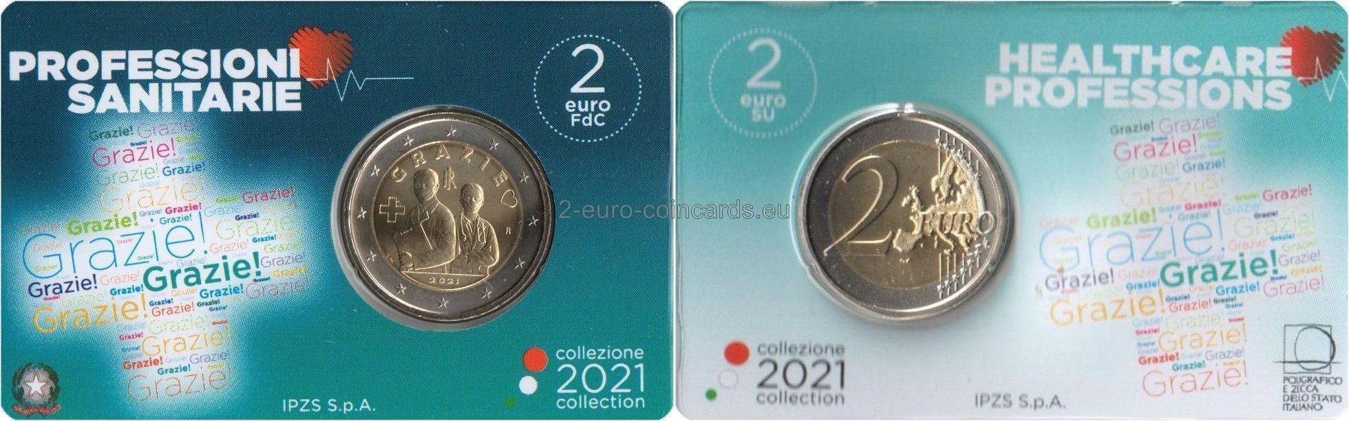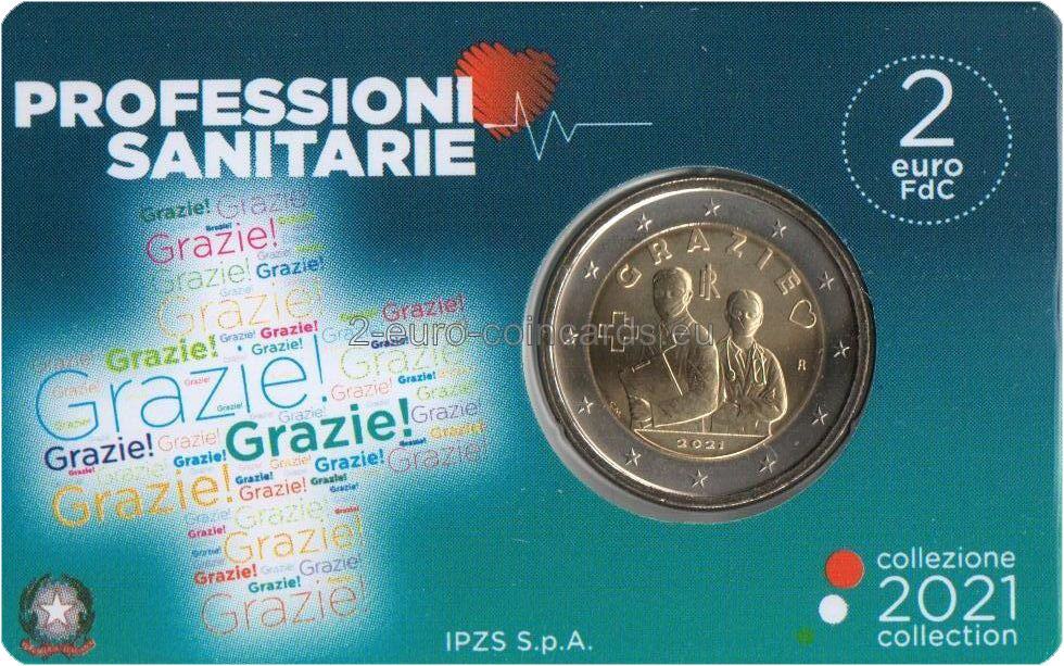 V strede vzoru sú vyobrazení muž a žena v lekárskych plášťoch a rúškach, so stetoskopom a zdravotnou dokumentáciou ako symbol lekárov a sestier, ktorí bojujú v prvej línii proti pandémii COVID-19. Hore je napísané slovo „GRAZIE“, vpravo za ním je znázornené srdce a naľavo zdravotnícky kríž. V strede sa nachádza skratka Talianskej republiky „RI“ a vpravo písmeno „R“, značka rímskej mincovne. Dole vľavo sú uvedené iniciály autorky vzoru Claudie Momoniovej „CM“ a v spodnej časti rok vydania mince „2021“.