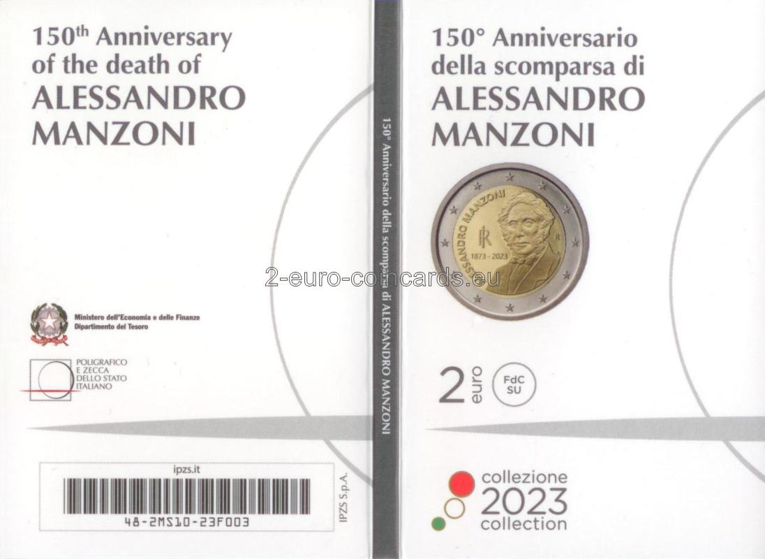 Na minci je vyobrazený polovičný portrét Alessandra Manzoniho podľa podobizne tohto talianskeho spisovateľa na bankovke v hodnote 100 000 lír vydanej v roku 1967. Vľavo sa nachádza skratka Talianskej republiky „RI“, roky „1873 – 2023“, t. j. rok úmrtia spisovateľa a rok vydania mince, a v polkruhu je uvedené meno spisovateľa „ALESSANDRO MANZONI“. Vpravo je zobrazené písmeno „R“ symbolizujúce rímsku mincovňu a písmená „AV“ predstavujúce iniciály autora motívu Antonia Vecchia.