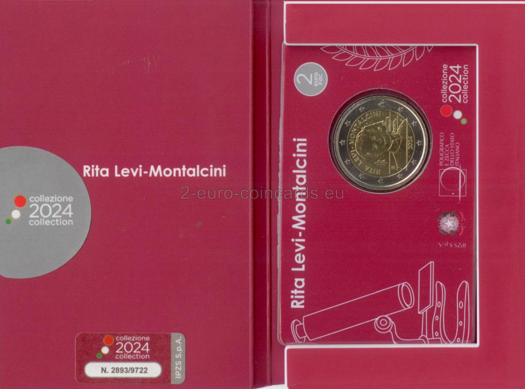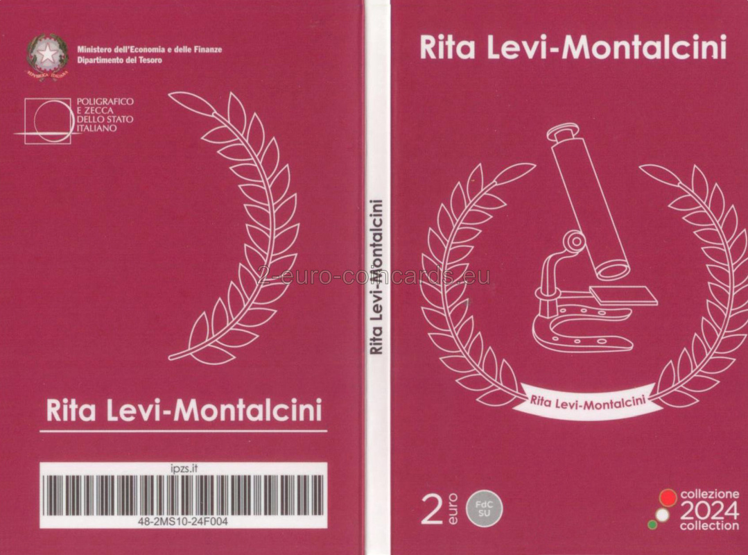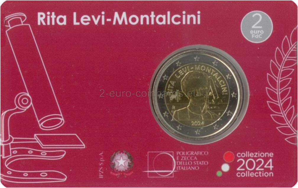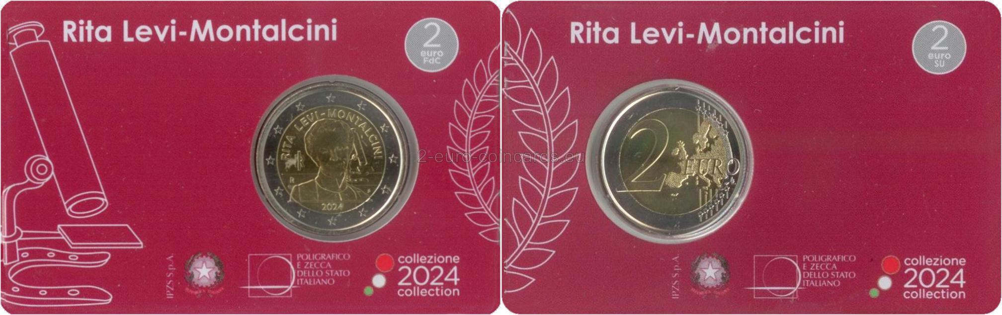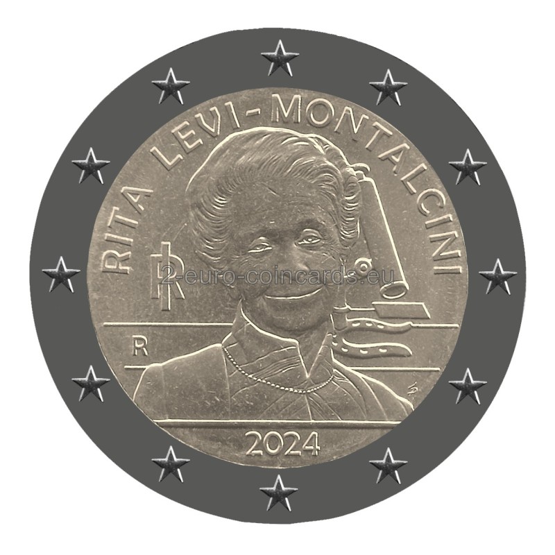 Motív v popredí zobrazuje portrét Rity Levi-Montalciniovej inšpirovaný fotografiou Manuely Fabbriovej. Na pozadí je vidieť mikroskop umiestnený na podstavci v tvare podkovy pôvodne z medaily, ktorú navrhol Gino Levi-Montalcini, brat uznávanej vedkyne, ako talizman pre šťastie pri príležitosti udeľovania Nobelovej ceny za medicínu v roku 1986. Nad portrétom je v polkruhu uvedený nápis „RITA LEVI-MONTALCINI“; vľavo sa nachádza skratka Talianskej republiky „RI“ a značka rímskej mincovne „R“. Pod portrétom je uvedený rok vydania mince „2024“, zatiaľ čo iniciály autorky motívu „SP“ Silvie Petrassiovej sú umiestnené vpravo