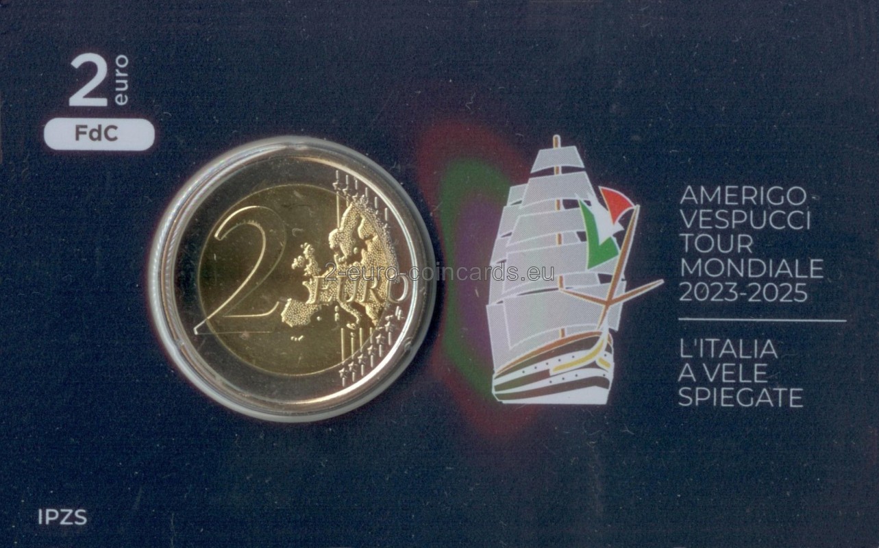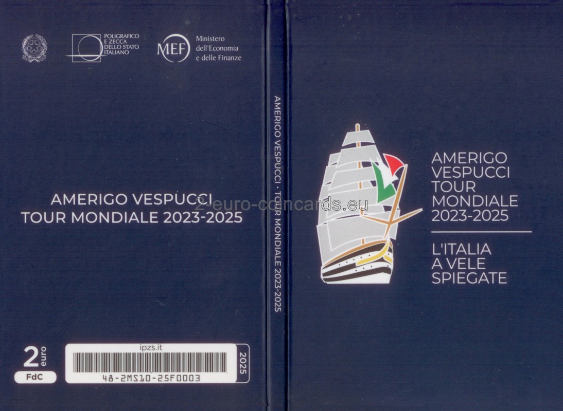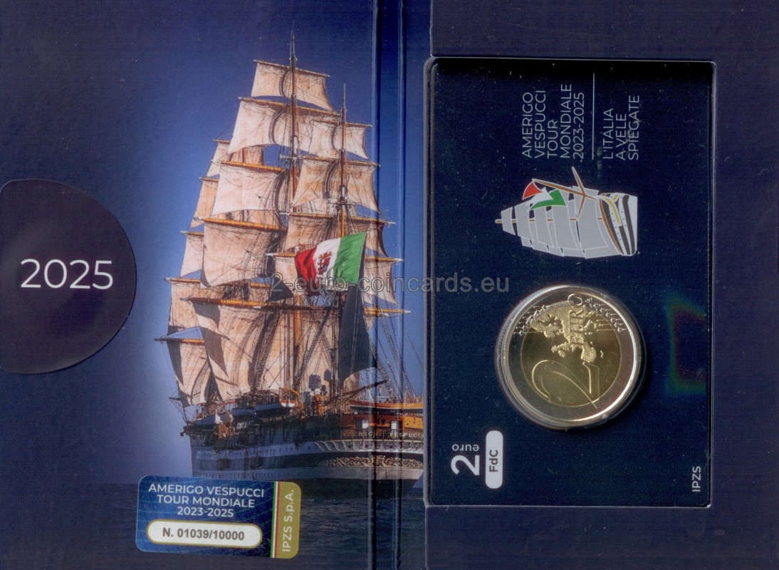 V strede motívu sa nachádza silueta lode Amerigo Vespuci ktorá s rozvinutými plachtami brázdi morské vlny, vľavo je nápis "AMERIGO VESPUCCI TOUR MONDIALE 2023-2025" Pod nápisom sa náchádza letopočet vydania mince "2025" a skratka Talianskej republiky „RI“. Vpravo je značka talianskej mincovne "R".