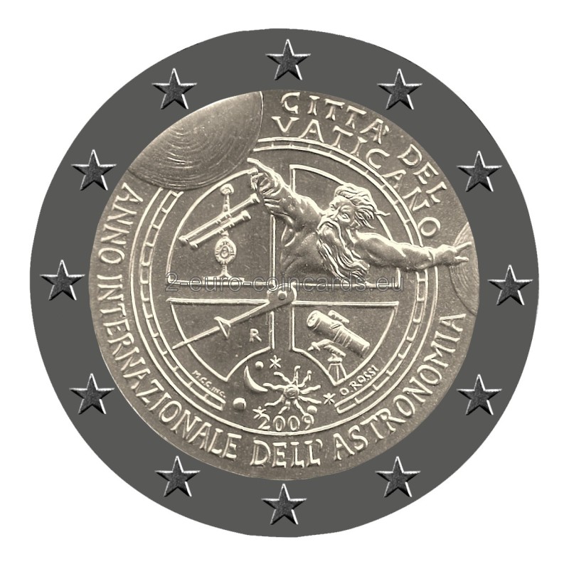 Vo vnútornej časti mince je zobrazená alegória vzniku hviezd a planét a viaceré astronomické prístroje. Dole je uvedená rok 2009, okolo sú značky mincovne (písmeno "R"), značky rytca "M.C.C. INC." a umelca "O.ROSSI". Motív je vľavo dole obklopený nápisom „ANNO INTERNAZIONALE DELL’ASTRONOMIA“ (Medzinárodný rok astronómie) a vpravo hore názvom vydávajúcej krajiny „CITTÁ DEL VATICANO“.