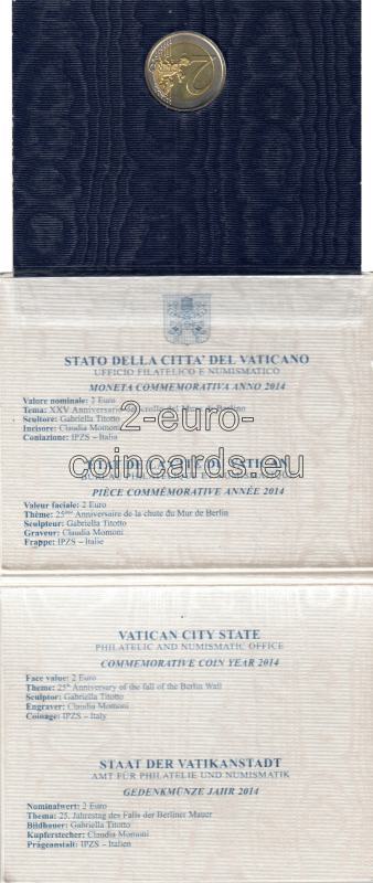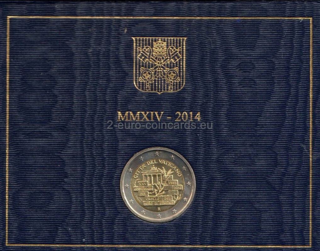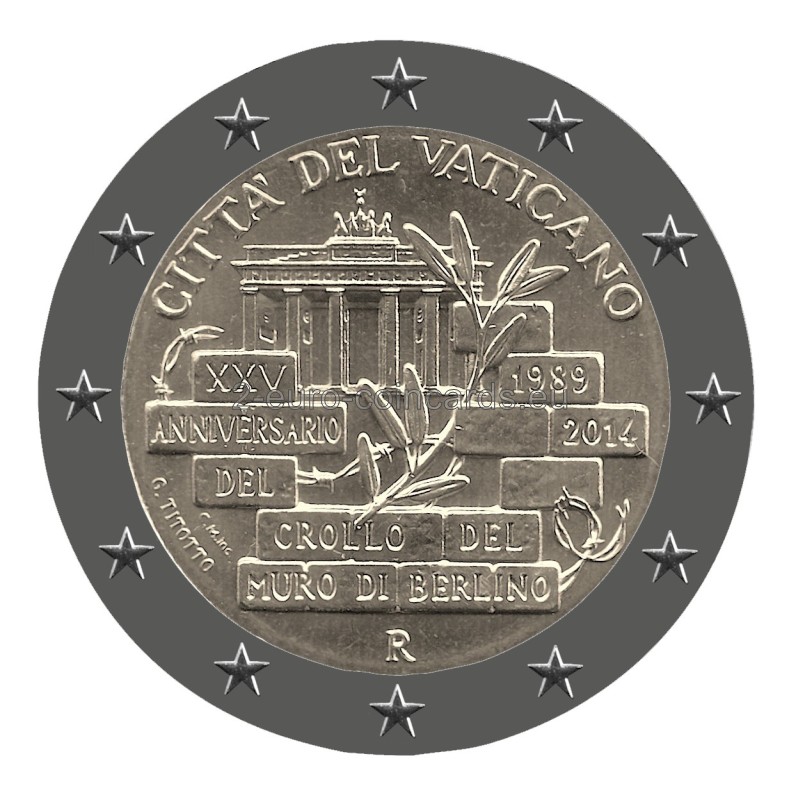 V popredí vzoru je zobrazených niekoľko tehál z čiastočne zbúraného Berlínskeho múra, na ktorých je nápis „XXV ANNIVERSARIO DEL CROLLO DEL MURO DI BERLINO 1989 2014“ (25. výročie pádu Berlínskeho múra 1989 2014). Uprostred vo voľnom priestore medzi tehlami a kúskom ostnatého drôtu je olivová ratolesť s Brandenburskou bránou v pozadí. Hornú časť vypĺňa nápis „CITTÀ DEL VATICANO“. V spodnej časti označenie mincovne (písmeno "R"). Na ľavom okraji je označenie rytca "C.M.inc" a umelca "G. TITOTTO".