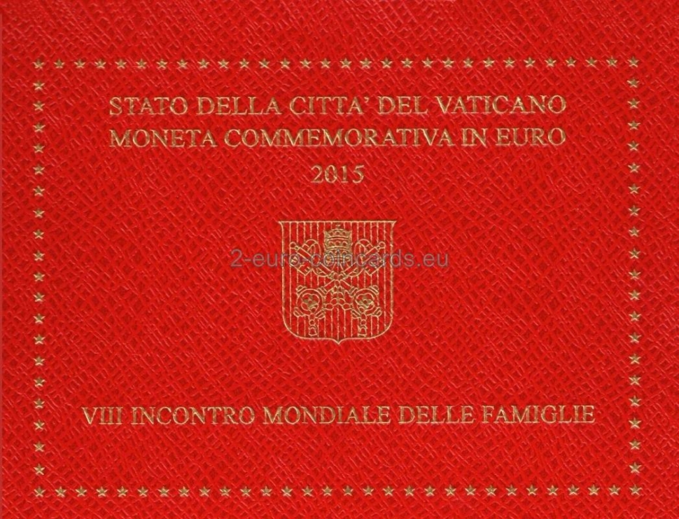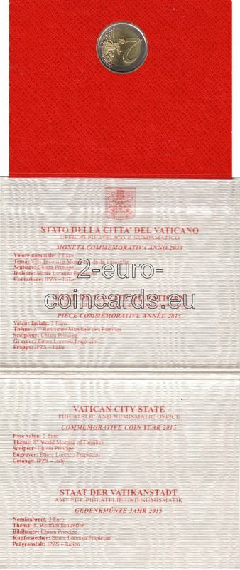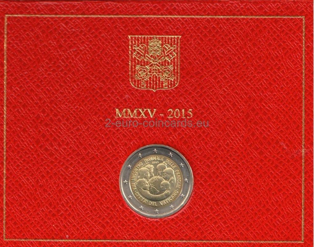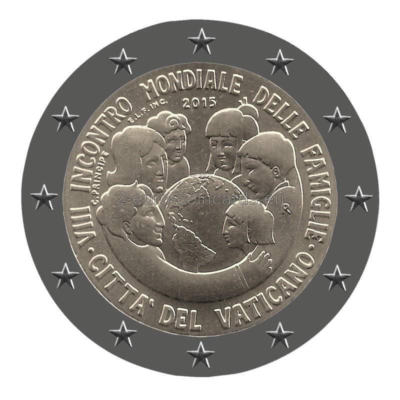 Vzor zobrazuje dve rodiny a ich ideálne objatie Zeme. V hornej časti mince sa nachádza rok vydania „2015“. Okolo vzoru sa nachádza v polkruhu zľava doprava nápis „VIII INCONTRO MONDIALE DELLE FAMIGLIE“ (VIII. Svetové stretnutie rodín) a v spodnej časti „CITTA' DEL VATICANO“. Vľavo sú značky umelca "C.Principe" a rytca "E.L.F. INC.". Na pravej strane je označenie mincovne (písmeno "R").