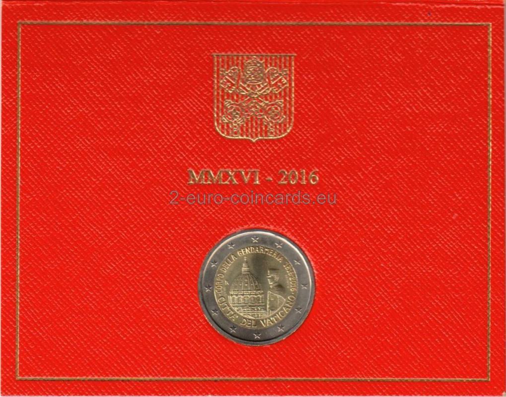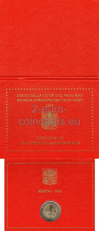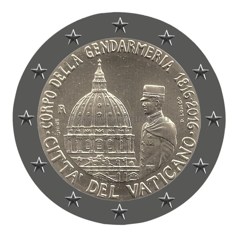Na národnej strane je vyobrazený príslušník vatikánskej polície pred Bazilikou svätého Petra V hornej časti sa v polkruhu nachádza nápis „CORPO DELLA GENDARMERIA 1816-2016“. V dolnej časti je v polkruhu uvedený názov vydávajúcej krajiny „CITTA‘ DEL VATICANO“. Značka mincovne „R“ a a označenie rytca "SP INC"sa nachádzajú na ľavej strane a meno autora „D. LONGO“ je uvedené vpravo.