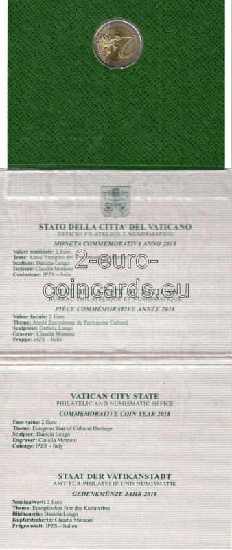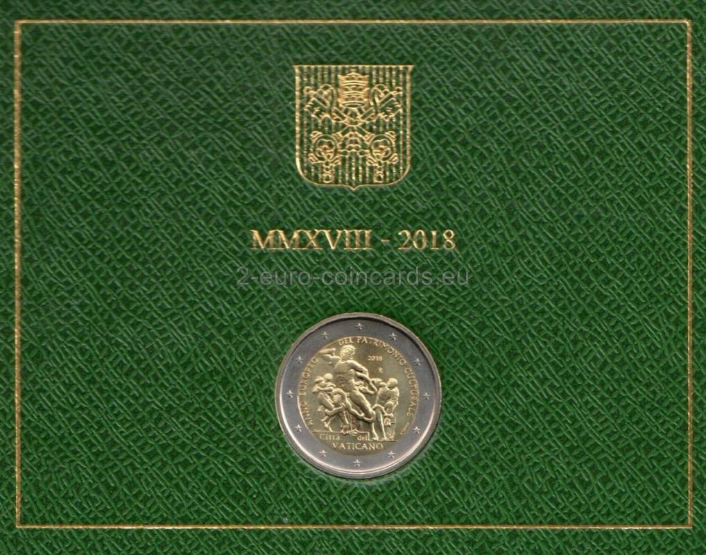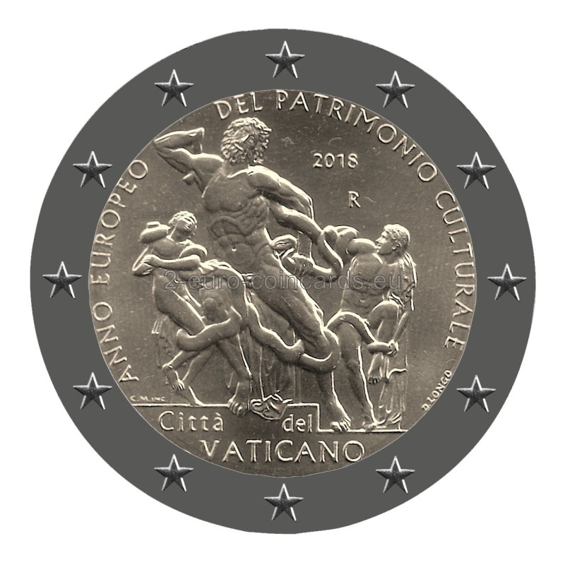 Ústredným motívom je súsošie Laokoón a jeho synovia, takisto známe pod názvom Laokontovo súsošie. Ide o zásadné dielo svetového sochárstva, ktoré tvorí základ zbierky Vatikánskych múzeí. Dolu v strede je umiestnený nápis vydávajúcej krajiny „Città del VATICANO“. V polkruhu v smere zľava doprava sa nachádza nápis „ANNO EUROPEO DEL PATRIMONIO CULTURALE“. V pravej hornej časti je uvedený rok vydania „2018“ a značka mincovne „R“. V pravej dolnej časti sa nachádza meno umelkyne „D. LONGO“ a značky rytca "C.M. INC".