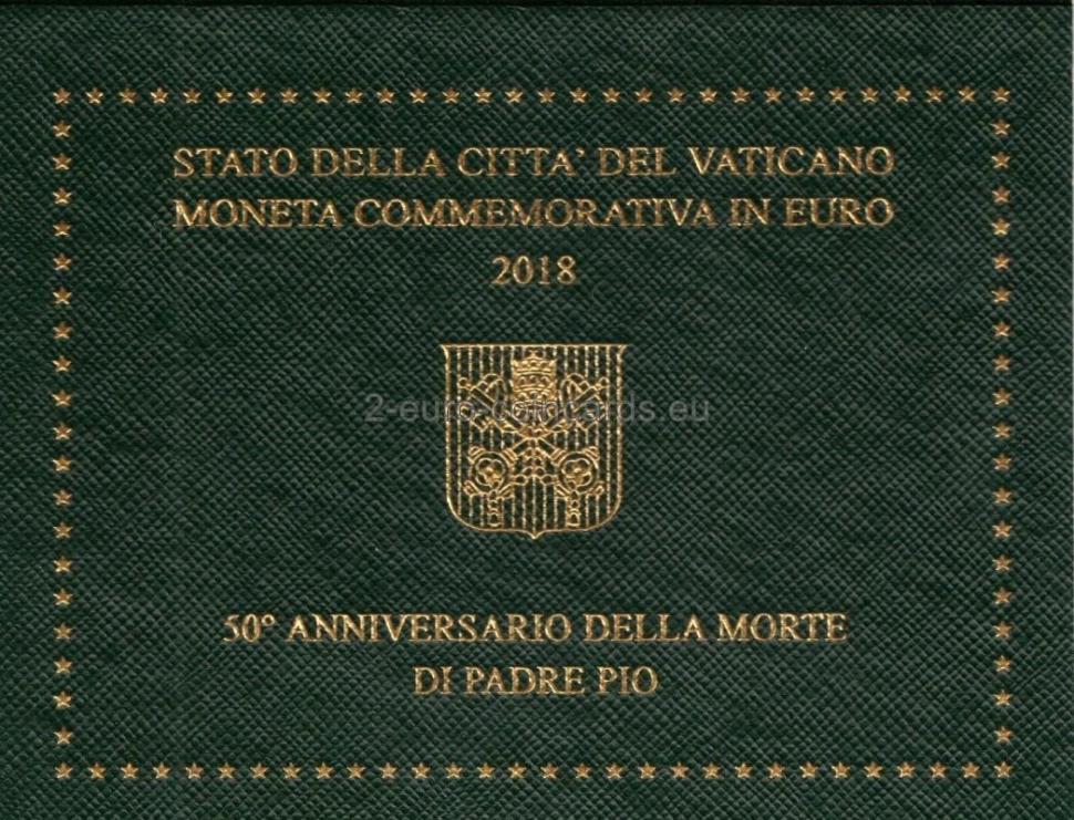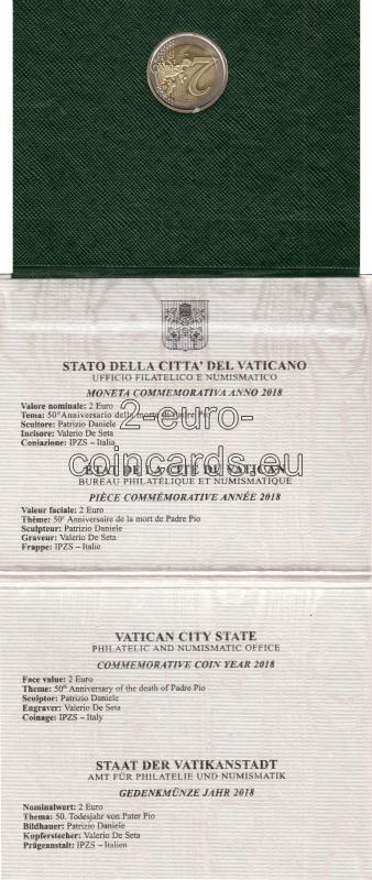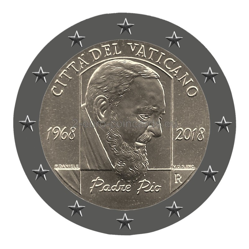 Na minci je vyobrazený portrét Pátra Pia z pravého profilu. V hornej časti je v polkruhu zľava doprava vpísaný názov vydávajúcej krajiny „CITTÀ DEL VATICANO“. V spodnej časti sa nachádza nápis „Padre Pio“ a napravo od neho značka mincovne „R“. Na ľavej strane vzoru je uvedený rok „1968“, na pravej rok vydania „2018“. Vľavo dole je meno umelca „P.DANIELE“.