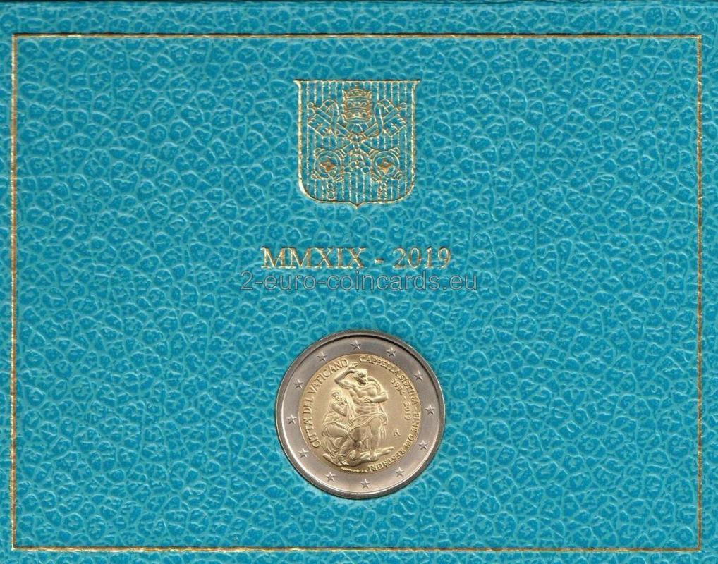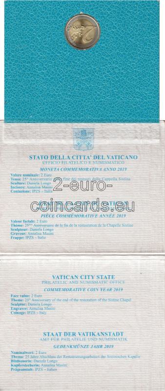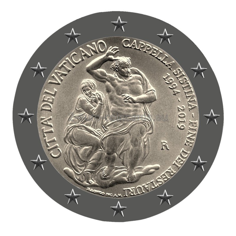Minca bol vydaná pri príležitosti ukončenia reštaurovania Sixtínskej kaplnky, ktoré prebehlo v rokoch 1994 – 2019. Vnútorný disk zobrazuje Pannu Máriu a Krista, fragment Michelangelovej fresky Posledný súd. Na ľavej strane disku je uvedený názov vydávajúceho štátu "CITTA' DEL VATICANO". Nápis na pravej strane, pozdĺž okraja disku: "CAPPELLA SISTINA - FINE DEI RESTAURI" (SIXTINSKA KAPLNKA - KONIEC REŠTAURÁCIE). V druhom riadku sú uvedené roky "1994-2019". V spodnej časti sú označenia umelca "D.LONGO" a rytca "INC.A.M.". Tiež symbol mincovne (písmeno "R").