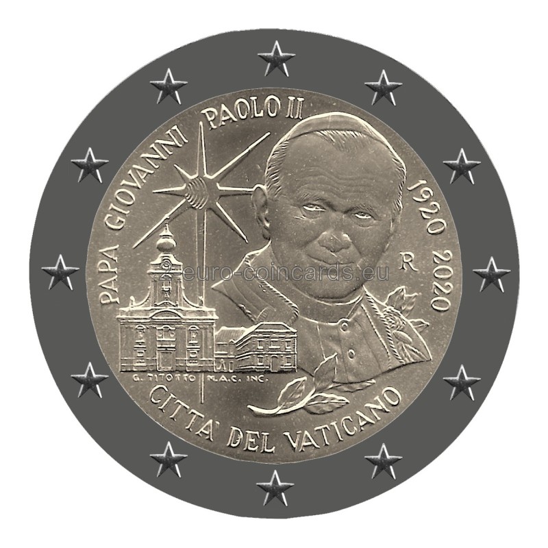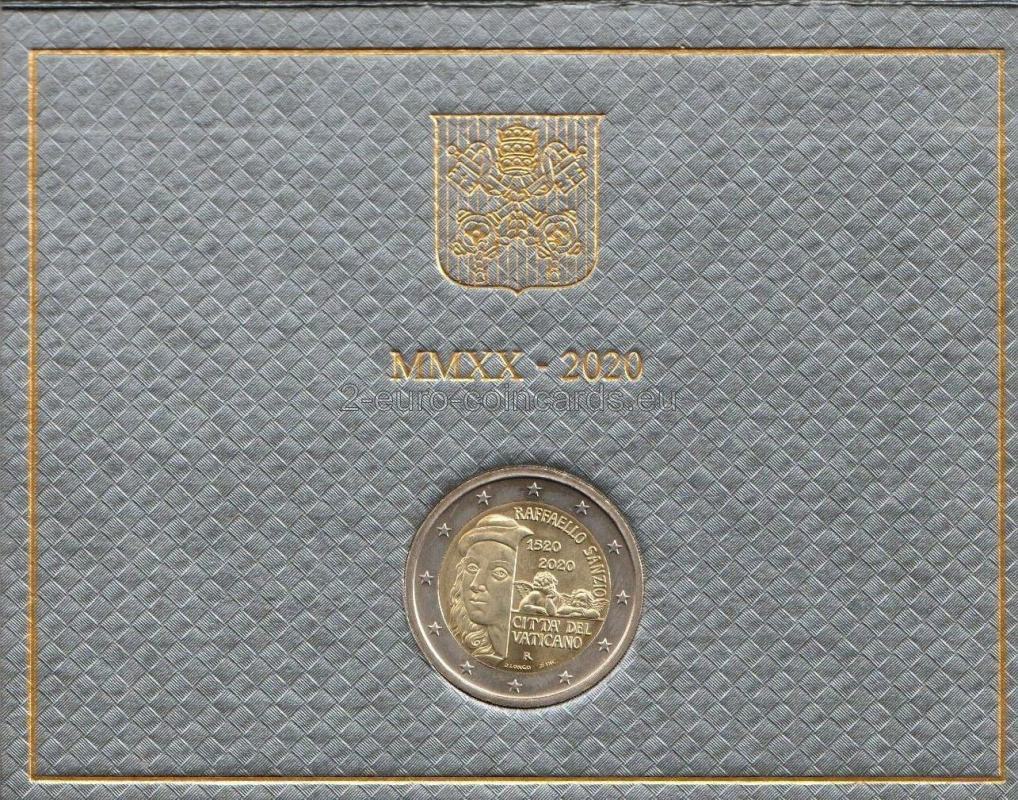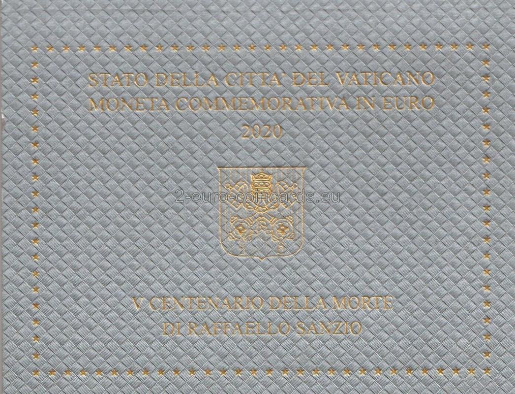 Vnútorný disk je rozdelený na dve časti. V ľavej časti je autoportrét Rafaela Santiho z fresky Aténska škola, v pravej časti je dvojica anjelov, fragment z obrazu Sixtínska madona. Na okraji disku vpravo je vyryté umelcovo meno "RAFFAELLO SANTI". Na pravej strane sú tiež letopočty Rafaelovej smrti "1520" a vydania mince "2020". Pod ním je názov vydávajúceho štátu "CITTA' DEL VATICANO" a značka mincovne (písmeno "R"). Pozdĺž spodnej časti kruhu je umiestnené meno umelca "D.LONGO" a iniciály rytca "SP INC".