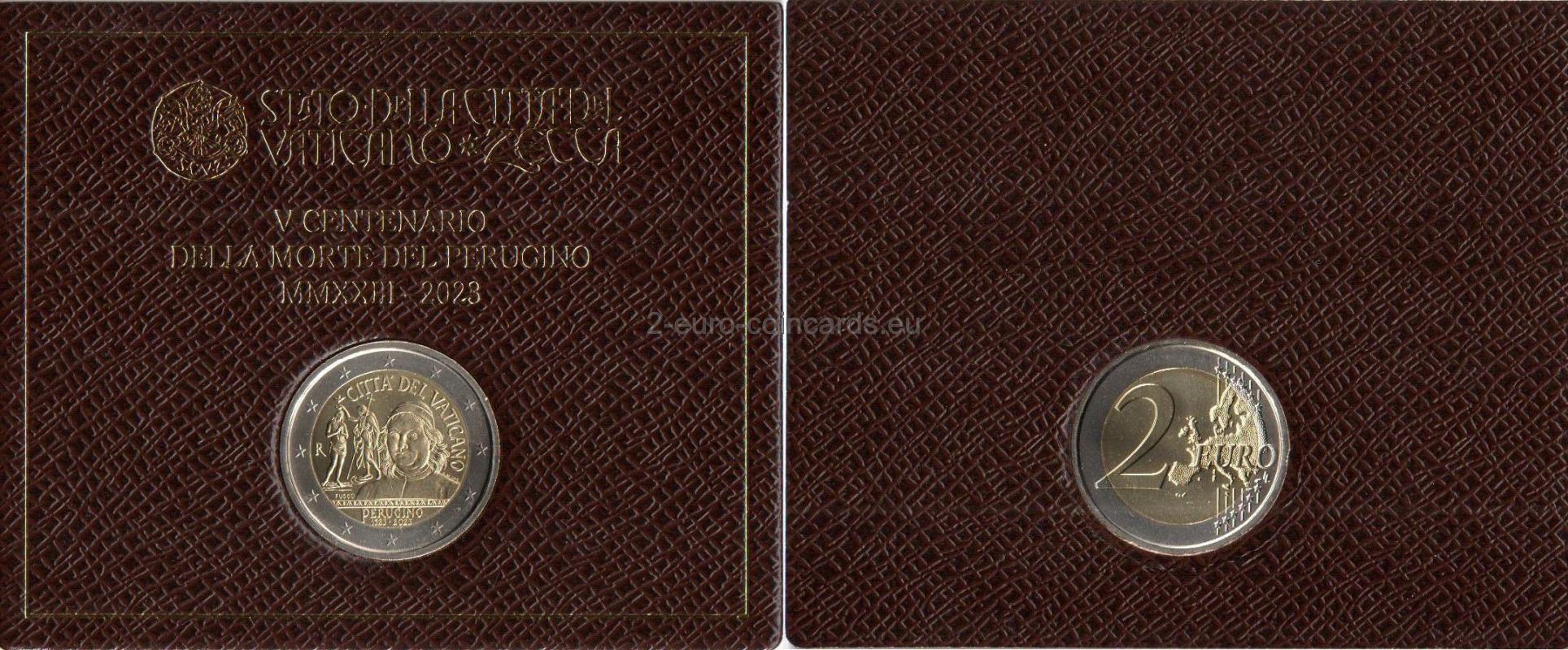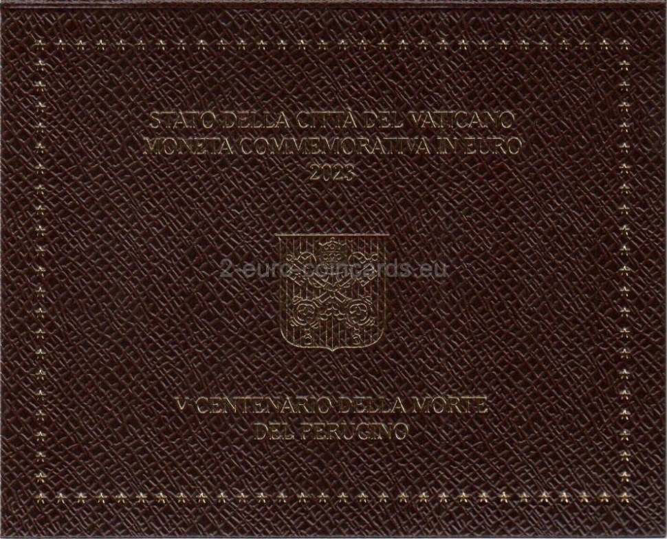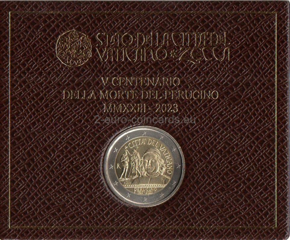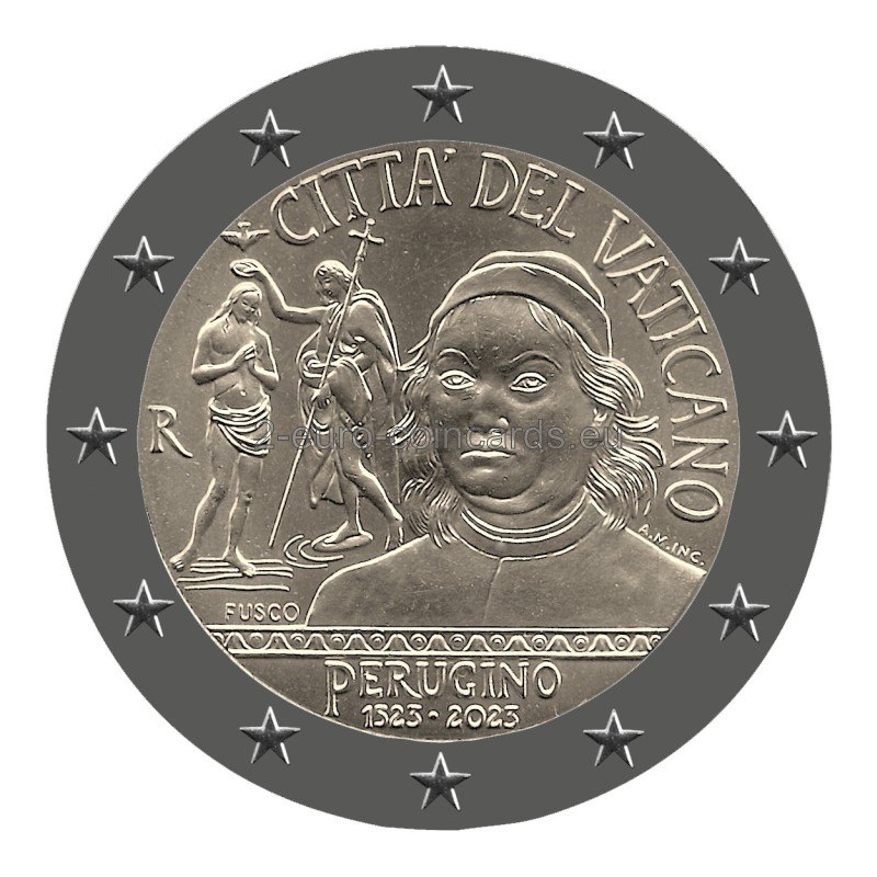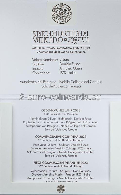 Na vzore je vyobrazený autoportrét Peruginiho a časť fresky "Krst Krista" zo severnej strany Sixtínskej kaplnky. V hornej časti je zľava doprava v polkruhu uvedený nápis „CITTÀ DEL VATICANO“. V dolnej časti sa nachádza nápis „PERUGINO “ a pod ním dátumy „1523◦2023“. Vľavo je značka mincovne "R" a meno autorky mince Daniely Fusco "FUSCO" a rytkyne Annalisi Masini "A.M. INC."