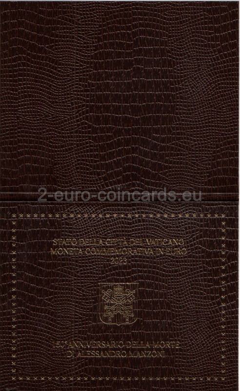 Na minci, ktorú navrhla výtvarníčka Gabriella Titotto, je v strede zobrazená spisovateľova tvár a pod ňou jeho podpis a letpočty 1873-2023; vpravo za kalamárom a brkom je incipit slávneho historického románu "I Promessi Sposi" (Zasnúbení). Vľavo je vavrínová ratolesť, ktorá svedčí o nesmrteľnej sláve veľkého spisovateľa a nad ňou je značka mincovne (písmeno „R“). Názov vydávajúceho štátu „CITTA' DEL VATICANO“ je napísaný pozdĺž okraja disku. Vpravo sú vyryté mená autorky vzoru Gabriella Titoto "G.TITOTO" a rytca Marta Bonifacio l"MB INC."